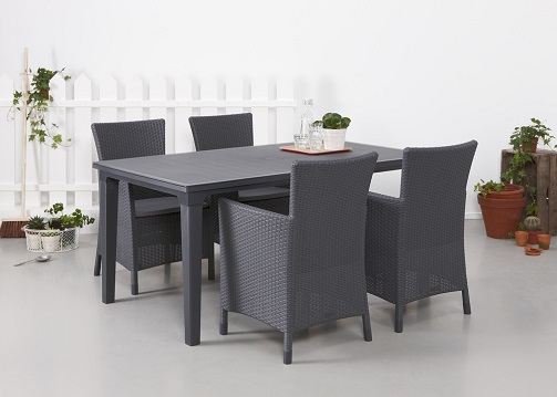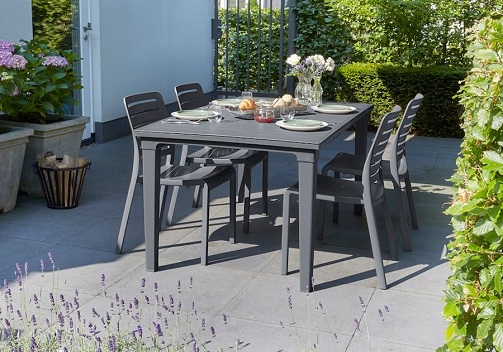Stół pomieści wygodnie 6 dorosłych osób.Idealny rozmiar do niemal każdego ogrodu lub balkonu. Wykończenie Resolith nadaje mu wygląd luksusowego drewna. Odporna na warunki atmosferyczne konstrukcja nie rdzewieje, nie niszczeje ani nie gnije, dzięki czemu jest bardzo łatwa w utrzymaniu. Zjedz posiłek w cieniu w słoneczne dni z parasolem. Stół chroniony przed promieniowaniem UV zachowuje swój żywy kolor nawet przy długim nasłonecznieniu.