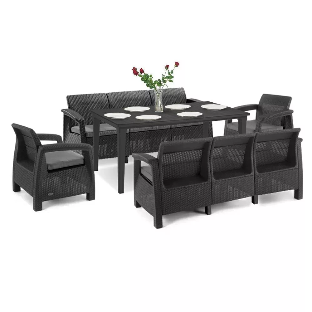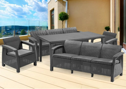 Głównymi zaletami mebli są wygoda i funkcjonalność. Zestaw mebli ogrodowych Corfu Love Max Duo został wykonany z materiału o wysokiej odporności na warunki atmosferyczne. Poduszki na sofy i fotele są zintegrowane, dzięki czemu są wodoodporne.