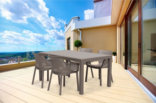 Stół wygodnie pomieści 4 lub nawet 6 osób. Idealny rozmiar do niemal każdego ogrodu lub balkonu. Wykończenie Resolith nadaje mu wygląd luksusowego drewna, a odporna na warunki atmosferyczne konstrukcja nie rdzewieje, dzięki czemu jest bardzo łatwy w utrzymaniu. Stół chroniony przed promieniowaniem UV zachowuje swój żywy kolor nawet w silnym świetle słonecznym.
