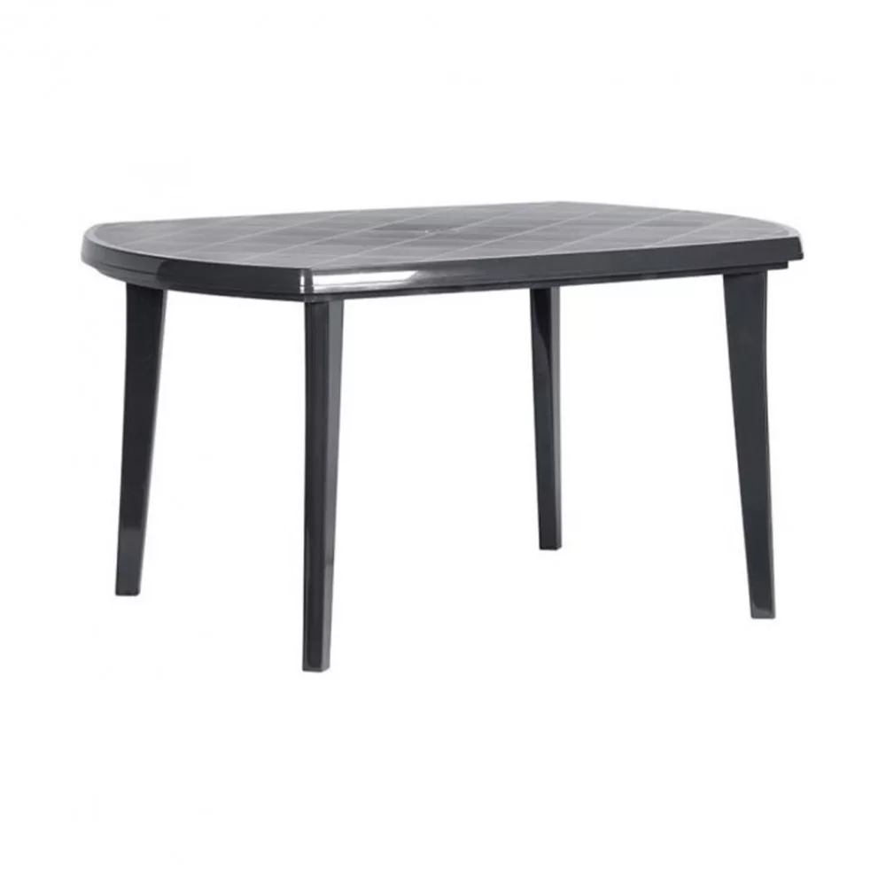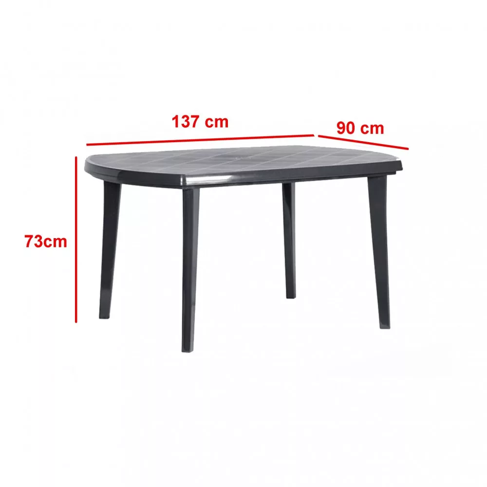 Powierzchnia z tworzywa sztucznego jest wysoce odporna na codzienne użytkowanie i czynniki atmosferyczne: słońce, deszcz i promieniowanie UV. Zachowa swoje pierwotne piękno przez wiele lat. Szeroki, owalny blat wygodnie pomieści 6 osób przy jednym stole.