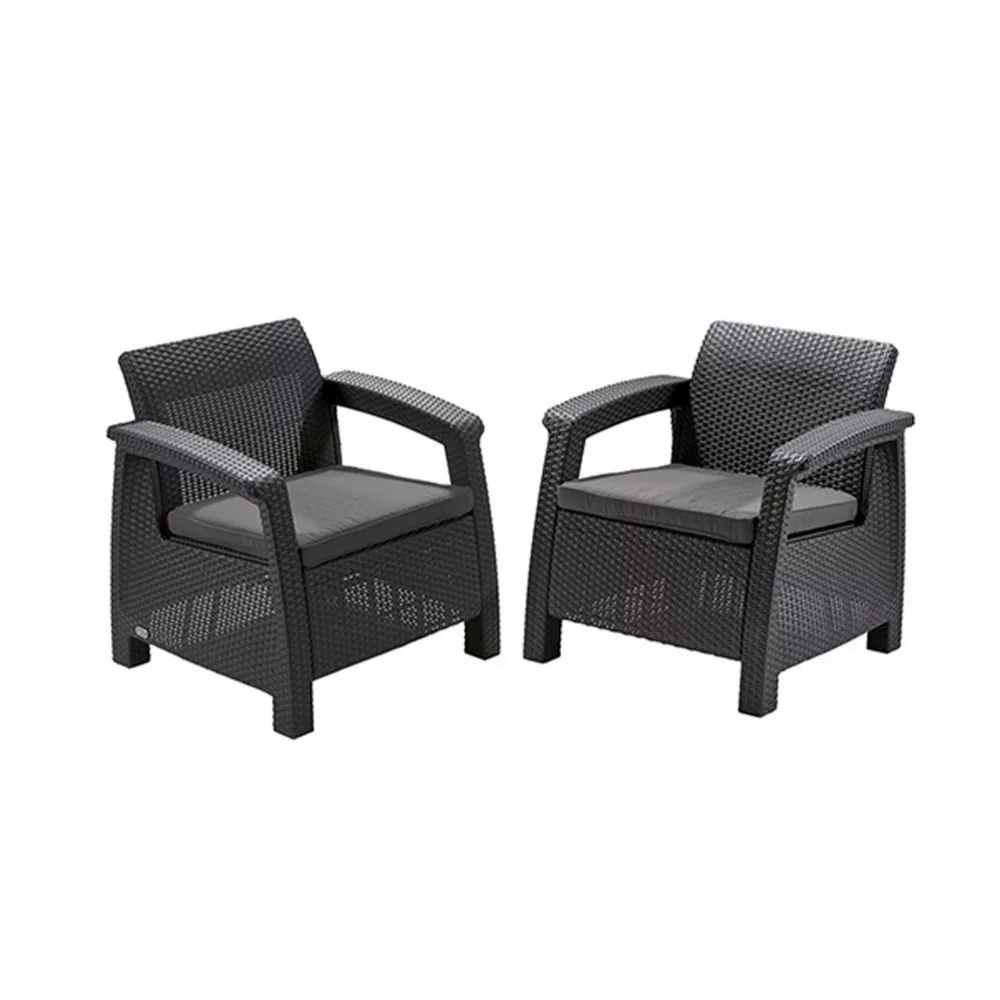Na pierwszy rzut oka może się wydawać, że meble są wykonane z rattanu, ale w rzeczywistości są one stworzone z wysokiej jakości materiału, który może wytrzymać ekstremalne warunki pogodowe. Płaskie poduszki, szerokie podłokietniki i wyprofilowane oparcia zapewniają komfort podczas korzystania z krzeseł ogrodowych. Producentem mebli jest marka Curver, która produkuje wysokiej jakości meble ogrodowe z formowanego wtryskowo tworzywa sztucznego. Działa w grupie ze znanymi i popularnymi w Polsce markami Keter i Allibert. Meble Korfu produkowane są w węgierskiej fabryce firmy. Jednolita kolorystyka i wzornictwo w ramach serii Korfu sprawia, że fotele Korfu Duo mogą stanowić uzupełnienie innych zestawów z tej serii.