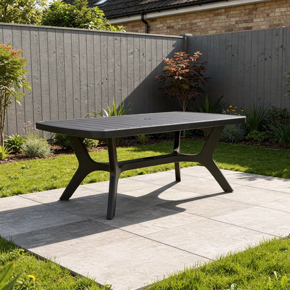 Stół ogrodowy Baltimore przyciąga uwagę prostym, czystym i nowoczesnym designem. Dzięki neutralnemu kolorowi wygląda dobrze w każdym otoczeniu i łatwo go dopasować do innych stylów mebli i akcesoriów. Nowoczesna, prosta konstrukcja jest łatwa w użyciu. Montaż wymaga zaledwie kilku prostych kroków. Można go skutecznie czyścić za pomocą gąbki nasączonej wodą z detergentem.