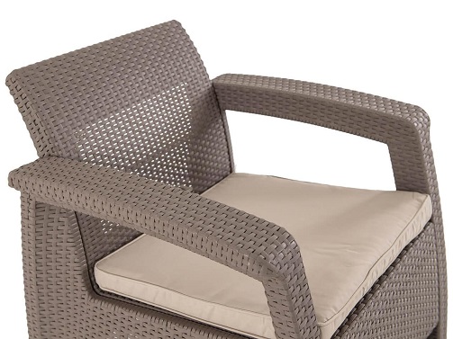 Wykonany z wytrzymałego tworzywa sztucznego zestaw mebli ogrodowych z podnoszonym stołem (Corfu Set Lyon Max ) wykonany jest z tworzywa sztucznego przypominającego technorattan, dzięki czemu stanowi godny zamiennik dla znacznie droższych mebli wiklinowych. Różnicę między tymi dwoma materiałami widać dopiero z bliska, gdyż technorattan jest przędzony ręcznie, a tworzywo sztuczne użyte do produkcji Corfu Lyon II Duo powstaje w wyniku fabrycznego przędzenia. Polipropylen to materiał odporny na promienie ultrafioletowe, wodę czy duże różnice temperatur.