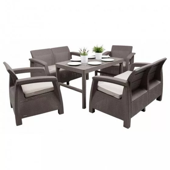 Zestaw ogrodowy Corfu Large Lyon z podnoszonym stołem w kolorze cappuccino, wykonany z polipropylenu. Kolejną ważną zaletą tego zestawu jest łatwość utrzymania go w czystości. Trudne do zmycia plamy, na przykład z wina, łatwo usunąć wilgotną ściereczką. Fabrycznie tłoczona plecionka, która wiernie imituje technorattan, doskonale sprawdza się na zewnątrz. Meble wykonane z tego materiału są odporne na złe warunki atmosferyczne. Kolejną zaletą jest to, że polipropylen nie jest wrażliwy na promienie UV. Oznacza to, że kolor nie wyblaknie nawet przy długotrwałej ekspozycji na słońce.