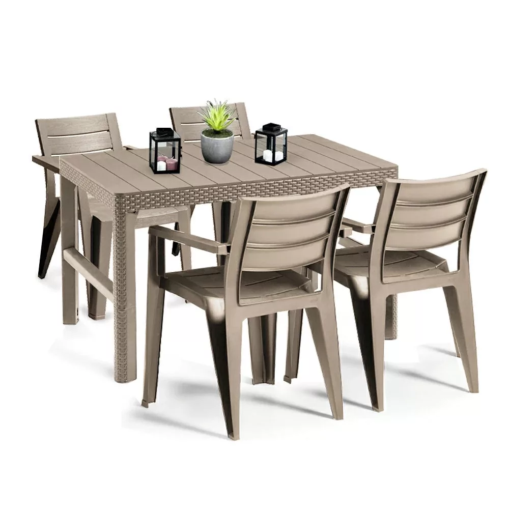 Ez a kerti garnitúra szett a Curver Lyon emelt kerti asztalból és 4 db Julie székből áll, amelyek együtt harmonikus, modern megjelenést nyújtanak. A szett ideális választás, ha szeretnél egy strapabíró, mégis elegáns kültéri bútorkombinációt, amely hosszú évekig megbízható társad lesz a kertben vagy a teraszon.