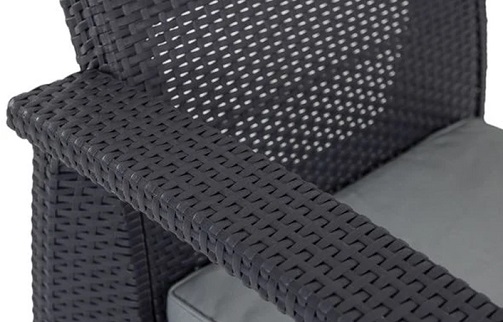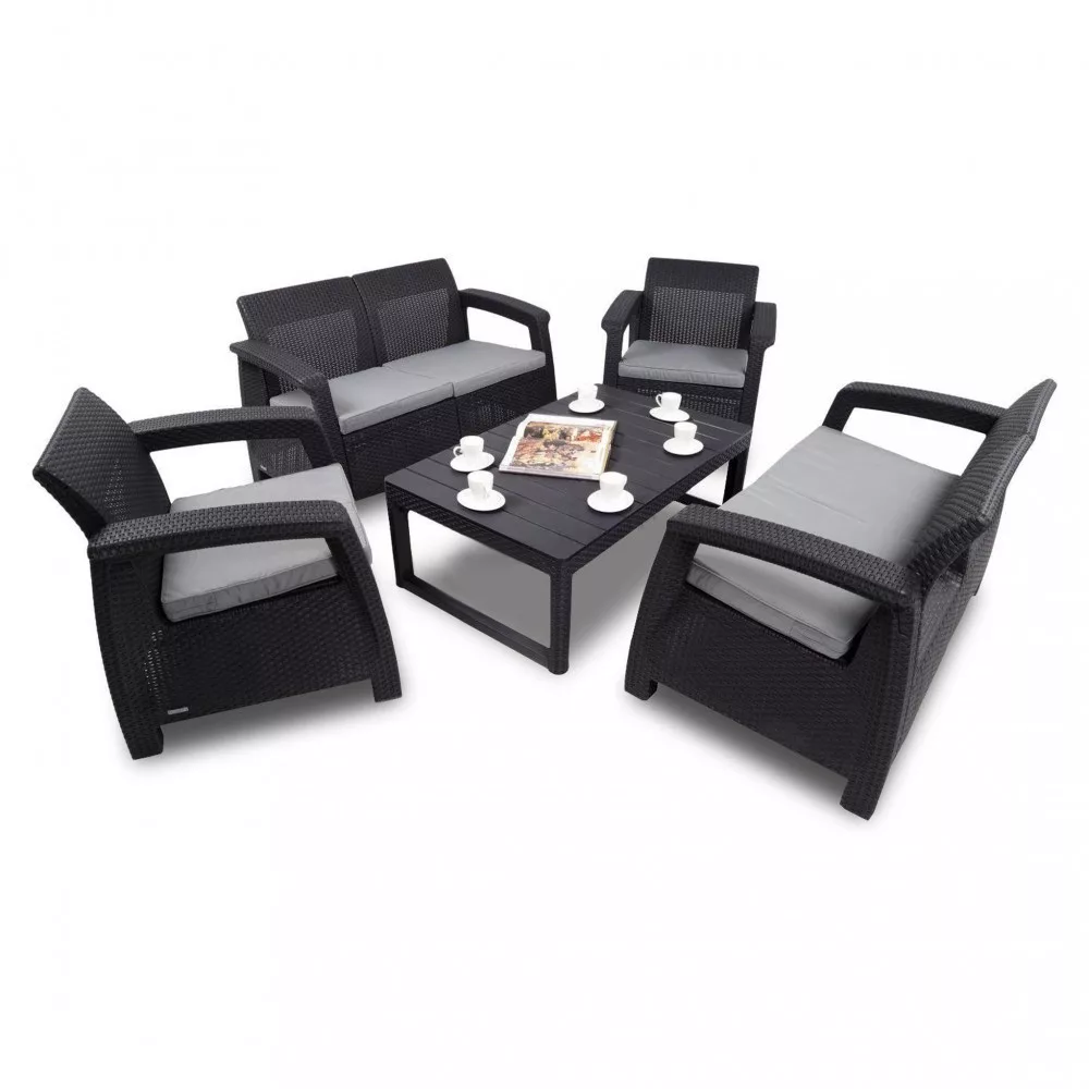 Meble ogrodowe Corfu Large II Lyon z podnoszonym stołem w kolorze grafitowym są niezwykle efektowne i bardzo wygodne. Blat i nogi stołu ozdobione są wzorem rattanowym (np. na meblach), natomiast gładki blat pokryty jest wzorem imitującym drewno. Gładka powierzchnia dostarczonego stołu zapewnia meblom dodatkową funkcjonalność. Miękkie poduszki siedziskowe, profilowane oparcia i szerokie podłokietniki gwarantują odpowiedni poziom komfortu. Podobnie elegancko prezentują się siedziska - gładka faktura poduszek na sofach i fotelach dobrze komponuje się z rattanowym wzorem.
