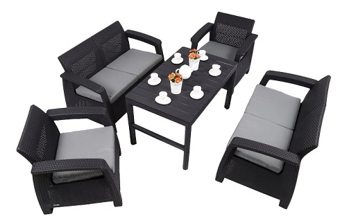 Meble ogrodowe Corfu Large II Lyon z podnoszonym stołem w kolorze grafitowym są idealne do relaksu w ogrodzie. W skład zestawu wchodzą dwa fotele, dwie dwuosobowe sofy oraz prostokątny, podnoszony stolik Lyon o wysokości 40 cm, który po otwarciu osiąga wysokość 65 cm. Zestaw wykonany jest z polipropylenu, który charakteryzuje się wysoką trwałością i odpornością na warunki atmosferyczne. Zestaw będzie się świetnie prezentował nie tylko w ogrodzie czy na tarasie, ale także w pomieszczeniach. Może z niego korzystać do 6 osób.