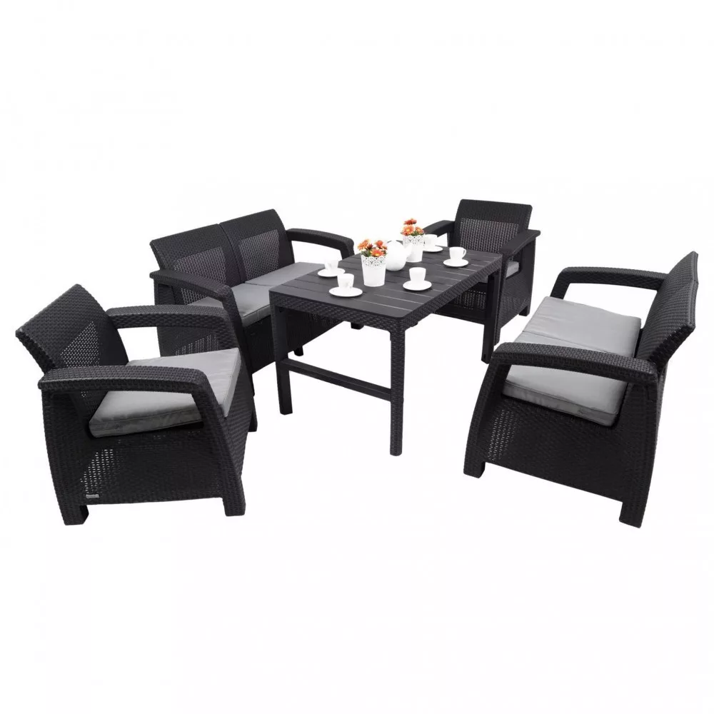 Meble ogrodowe Corfu Large Lyon z podnoszonym stołem w kolorze grafitowym są niezwykle efektowne i bardzo wygodne. Blat i nogi stołu ozdobione są wzorem rattanowym (np. na meblach), natomiast gładki blat pokryty jest wzorem imitującym drewno. Gładka powierzchnia dostarczonego stołu zapewnia meblom dodatkową funkcjonalność. Miękkie poduszki siedziskowe, profilowane oparcia i szerokie podłokietniki gwarantują odpowiedni poziom komfortu. Podobnie elegancko prezentują się siedziska - gładka faktura poduszek na sofach i fotelach dobrze komponuje się z rattanowym wzorem.