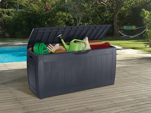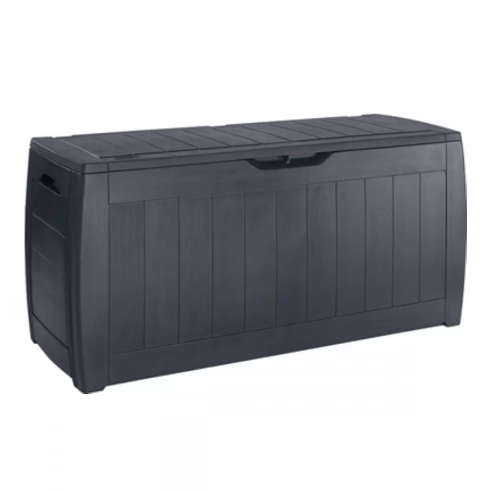 Funkcjonalny i pojemny, o pojemności 270 litrów, pojemnik ogrodowy wyprodukowany przez renomowaną firmę Keter, która posiada bogate doświadczenie w tworzeniu wyposażenia ogrodowego z tworzywa sztucznego. Pojemnik ogrodowy to idealne miejsce do przechowywania poduszek na krzesła ogrodowe, zabawek czy innych elementów wyposażenia ogrodu. Choć wyglądem przypomina drewnianą skrzynię ogrodową, jest to jedynie zabieg stylistyczny wykonywany w procesie produkcji. Skrzynia Keter Hollywood Box wykonana jest w całości z mocnego i trwałego tworzywa sztucznego. Dzięki temu jest wodoodporna, odporna na promieniowanie UV i przyjazna dla środowiska. Większość materiałów wykorzystywanych do produkcji produktów Keter pochodzi z recyklingu.