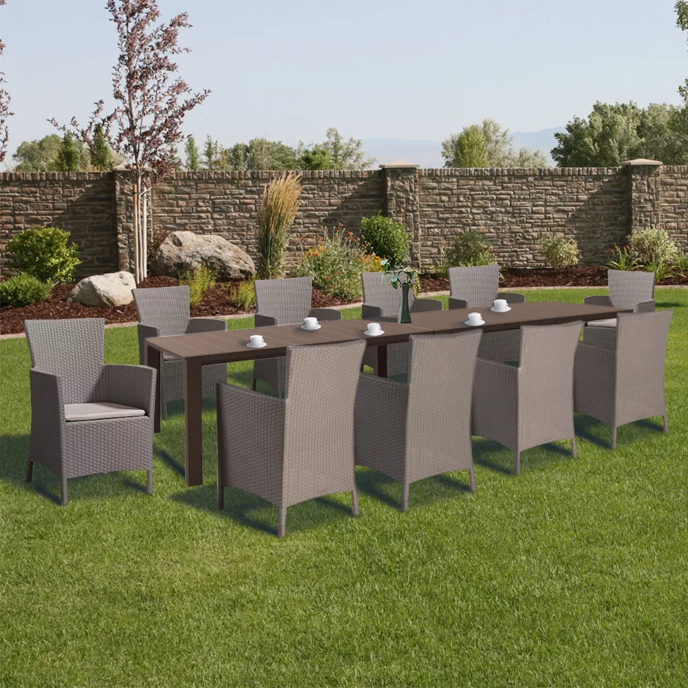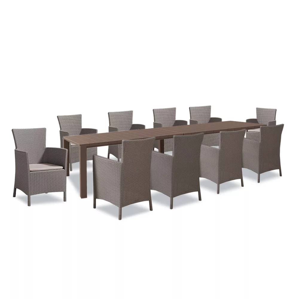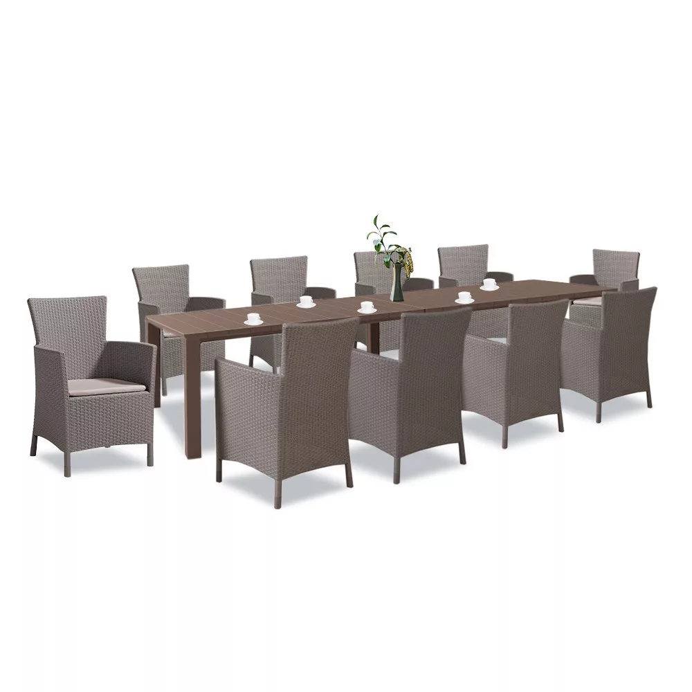 Zestaw plastikowych mebli ogrodowych w kolorze cappuccino składa się z dziesięciu krzeseł o wymiarach 60 x 62 x 89 cm i dwóch stołów o wymiarach 147,5 x 90 x 74,5 cm. Jest to wysokiej jakości produkt wykonany z najlepszej jakości tworzywa sztucznego formowanego wtryskowo.