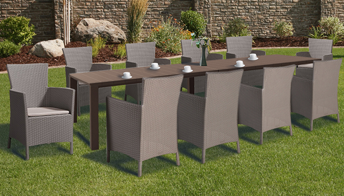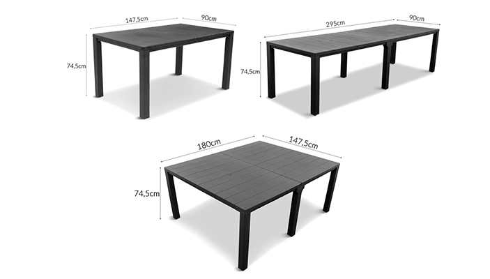 10-częściowy zestaw mebli ogrodowych Juowa to idealne rozwiązanie do okazjonalnych dużych spotkań z rodziną lub przyjaciółmi na patio lub w ogrodzie, a także do siedzenia dla dużej liczby gości. Doskonała alternatywa dla dostępnych na rynku produktów z syntetycznego rattanu. Prezentowany stół ogrodowy wyróżnia się na tle swoich odpowiedników tym, że może być tworzony w 3 konfiguracjach - stoły z dłuższymi bokami łączonymi ze sobą, stoły z krótszymi bokami łączonymi ze sobą oraz wersja stołu do codziennego użytku. Lekka, a zarazem wytrzymała konstrukcja sprawia, że czyszczenie mebli jest bardzo proste. Zestaw jest również odporny na uszkodzenia oraz długotrwałe działanie czynników atmosferycznych i promieniowania UV.