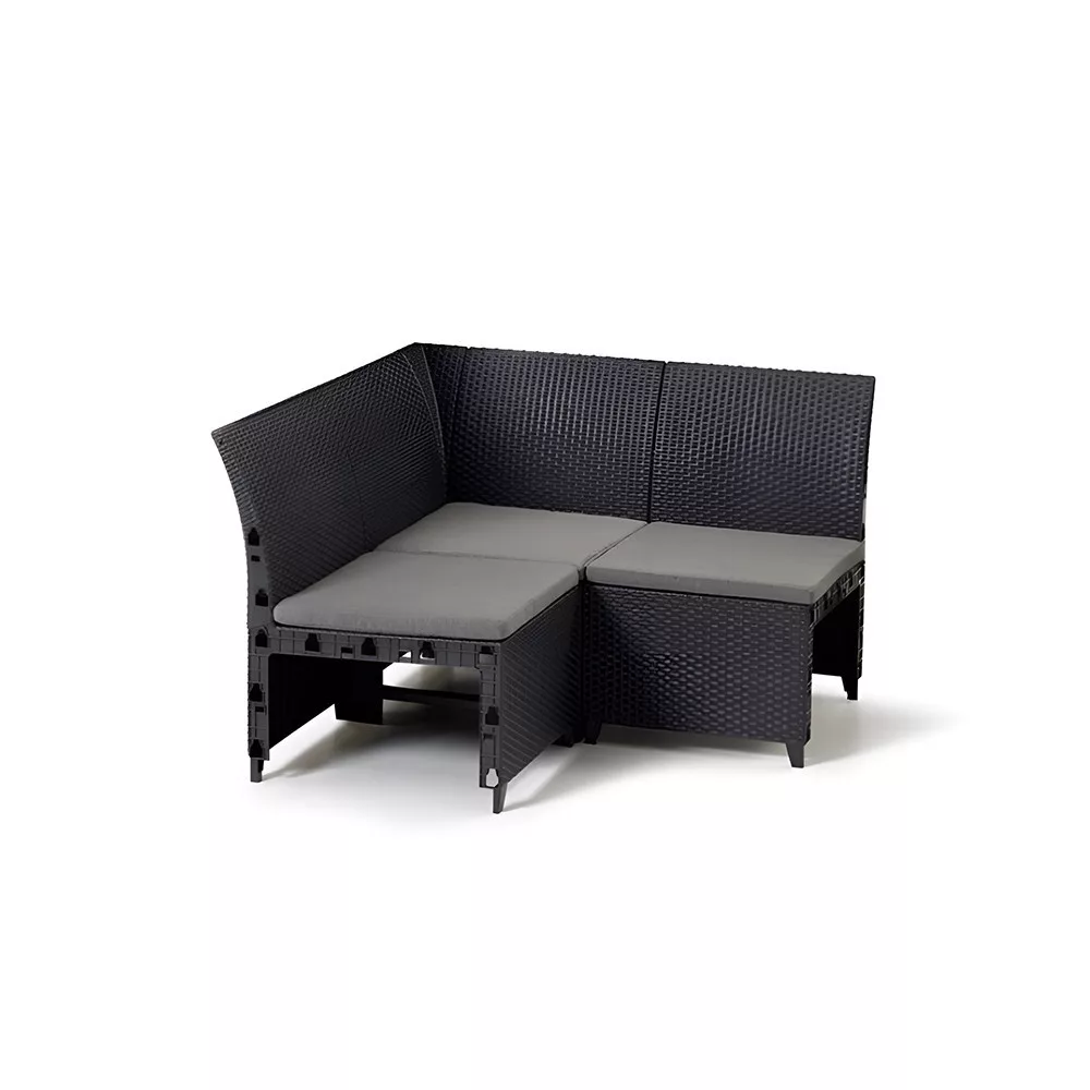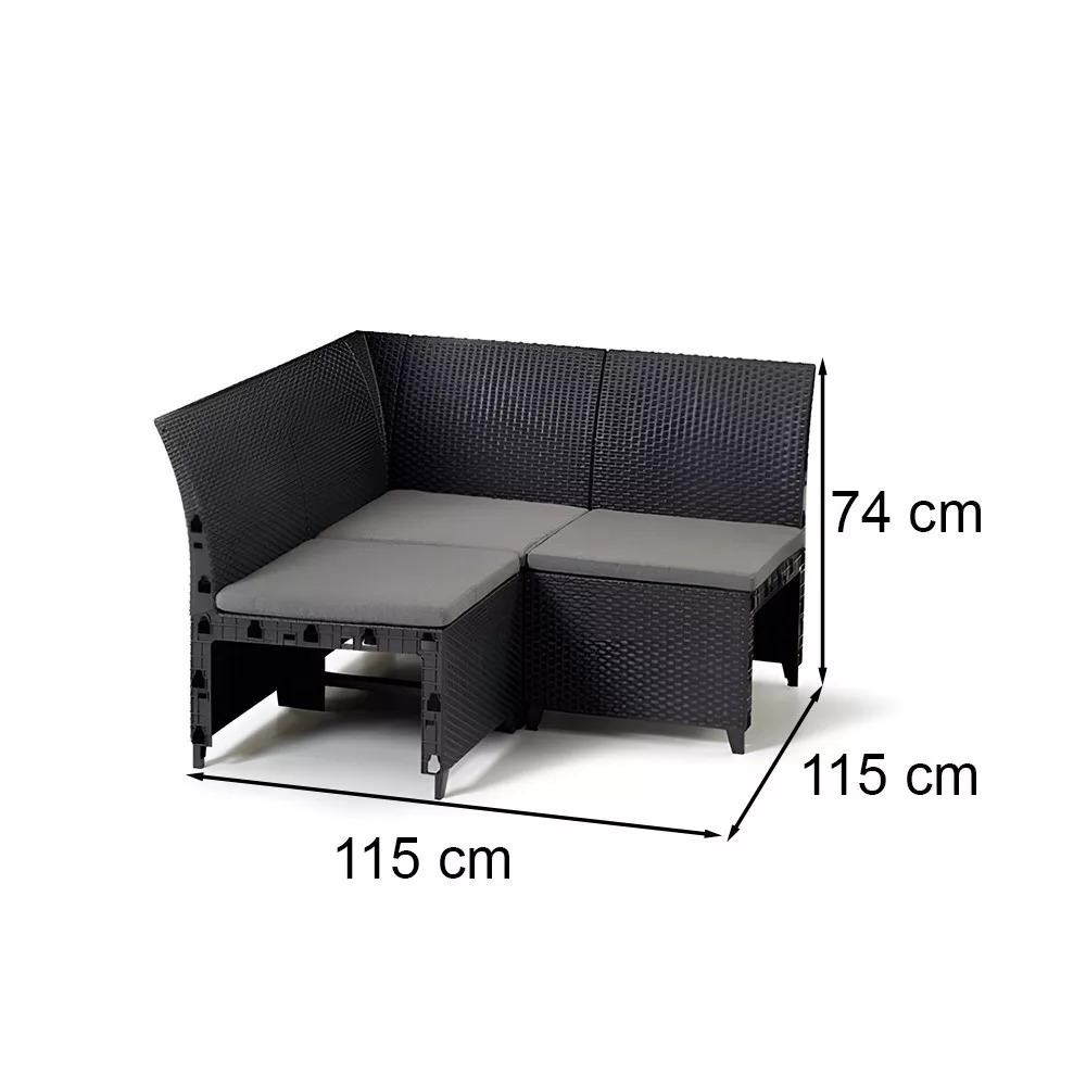 Narożnik Rosalie o wymiarach 115 cm x 115 cm i wysokości 74 cm idealnie pasuje do nowoczesnych zestawów mebli ogrodowych. Pozwala dostosować rozmiar sofy do osobistych potrzeb.