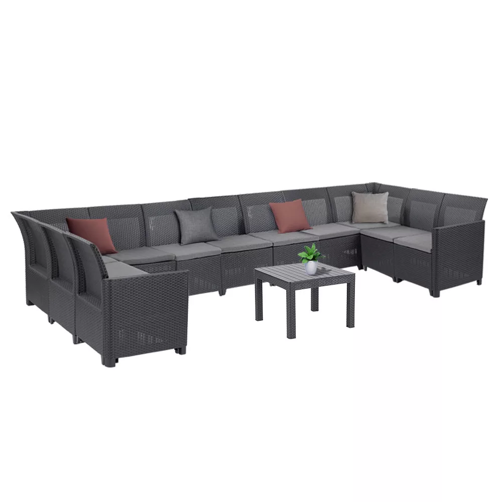 Zestaw składa się z 2 sof narożnych, sofy 3-osobowej, kilku oddzielnych elementów i stołu Orlando o wymiarach 59x59x43 cm - oferując łącznie wygodne miejsca siedzące dla 11 osób.