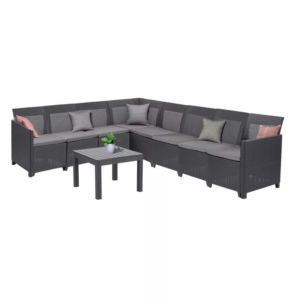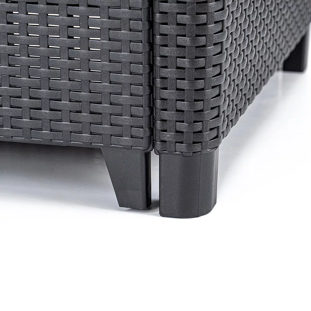 Nowoczesne, ciemnoszare wykończenie z efektem rattanu jest estetyczne i wysoce odporne na warunki atmosferyczne - nie blaknie ani nie pęka, a nawet ma ochronę przed promieniowaniem UV. Miękkie poduszki na siedziska są dołączone do zestawu, dzięki czemu można od razu zacząć z niego korzystać.