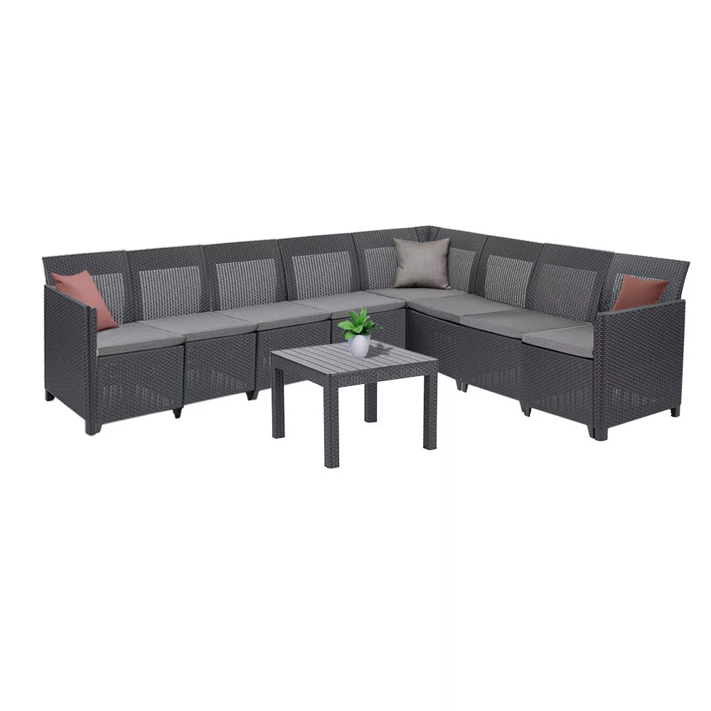 Claire XI 8-osobowy zestaw narożny ze stołem orlandoZestaw, który dostosowuje się do Ciebie - zmienny, rozszerzalny, beznarzędziowy montaż8-osobowy zestaw narożny Keter Claire XI ze stołem Or lando to idealny wybór, jeśli szukasz mebli ogrodowych, które dostosowują się do Ciebie - a nie odwrotnie. Poszczególne elementy mogą być używane oddzielnie, a podłokietniki są zdejmowane, dzięki czemu można je rozbudowywać, przekształcać lub łączyć z nowymi elementami. Dzięki beznarzędziowemu systemowi "click-in" montaż zajmuje zaledwie 10 minut.Nowoczesne, ciemnoszare wykończenie z efektem rattanu jest estetyczne i wysoce odporne na warunki atmosferyczne - nie blaknie, nie pęka, a nawet ma ochronę przed promieniowaniem UV. Miękkie poduszki na siedziska są dołączone do zestawu, dzięki czemu można od razu zacząć z niego korzystać.Ciesz się każdym centymetrem kwadratowym swojego tarasu - wygodnie dla 8 osóbJedną z największych zalet zestawu Claire jest to, że idealnie nadaje się zarówno do małych, jak i dużych przestrzeni.Zestaw dla 8 osób składa się z różnych elementów:1 sofa trzyosobowa (163×65×74 cm)5 oddzielnych foteli (63×65×74 cm)1 kwadratowy stolik Orlando (59×59×43 cm)Wszystkie elementy zapewniają jednolity, elegancki wygląd, ale można je również dowolnie zaaranżować - niezależnie od tego, czy jest to symetryczny narożnik w kształcie litery L, oddzielne siedzenia, czy przyjazna kawiarnia w rogu ogrodu.Stół Orlando jest idealny na kawę, lemoniadę, a nawet grę planszową. Gładki blat resolith jest łatwy w czyszczeniu, więc żaden rozlany napój nie spowoduje bólu głowy.Beztroskie lato - odporne na warunki atmosferyczne, chronione przed promieniowaniem UV, bezobsługoweKażda część zestawu Claire jest wykonana tak, aby wytrzymać rygory panujące na zewnątrz. Wykonana z tworzywa sztucznego odpornego na warunki atmosferyczne powierzchnia z efektem rattanu nie pęka, nie wchłania wody i jest łatwa do czyszczenia wilgotną szmatką. Poduszki w zestawie są zdejmowane, a cały mebel nie wymaga konserwacji, więc nie trzeba go olejować, malować ani obawiać się zamoczenia. Wykończenie odporne na promieniowanie UV zapobiega blaknięciu na słońcu - dzięki czemu zachowa swój doskonały wygląd przez wiele lat.Trwałe materiały i szybki montaż - pomyśl o komforcie!Zestaw Claire jest poparty doświadczeniem firmy Keter i praktycznym podejściem projektantów Leziter. Modułowa konstrukcja wykonana jest z wytrzymałych elementów polipropylenowych, które są zarówno ponadczasowe, jak i lekkie - przenoszenie ich jest łatwe. Innowacyjny system zatrzaskowy pozwala każdemu na łatwy montaż bez użycia narzędzi.Komu polecamynarożnik 8-osobowy KeterClaireXI ze stołem Orlando?Zestaw narożny Claire XI polecany jest wszystkim tym, którzy:nie chcą rezygnować z komfortu w ogrodzie lub na balkonie,szukają nowoczesnego, spójnego, ale elastycznego mebla ogrodowego,zależy im na szybkim montażu i odporności na warunki atmosferycznechcą mieć zestaw wypoczynkowy z możliwością rozbudowy i personalizacji,oraz dla tych, którzy szukają niezawodnych, wygodnych miejsc siedzących dla 6-8 osób dla rodziny i przyjaciół.Kup zestaw i ciesz się relaksem na świeżym powietrzu już dziś - bez kompromisów!