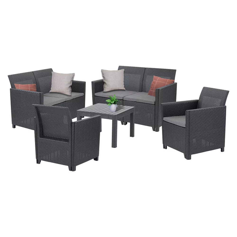 - Kolor: Grafitowe meble z szarymi poduszkami
