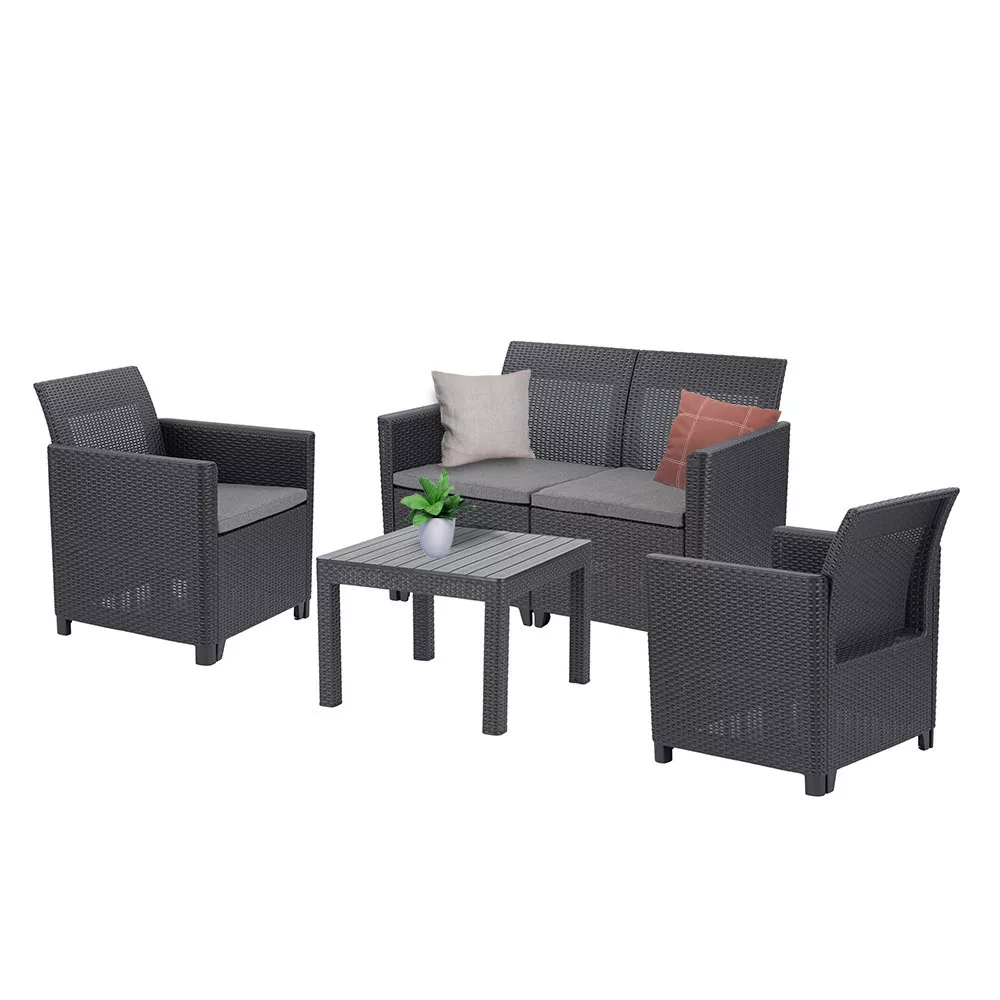 Konstrukcja foteli i sofy zapewnia wygodne oparcie, a szare poduszki na siedziska gwarantują komfortowy wypoczynek na świeżym powietrzu.