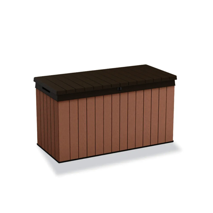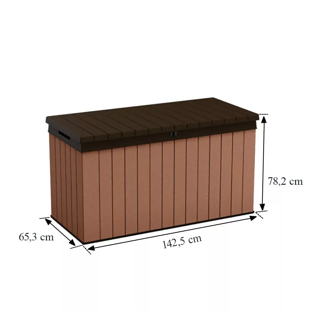 Skrzynia ogrodowa Darwin - praktyczna - idealna do przechowywania narzędzi ogrodowych i zabawek. Drewniana teksturowana obudowa nadaje stylowy wygląd, idealnie komponując się z wyglądem ogrodu. Trwała i odporna na warunki atmosferyczne skrzynia nie rdzewieje, nie ulega uszkodzeniom fizycznym ani nie pleśnieje - będzie wyglądać równie pięknie po wielu latach użytkowania. Boczne uchwyty umożliwiają łatwe przenoszenie, a zamykana pokrywa chroni zawartość wewnątrz.
