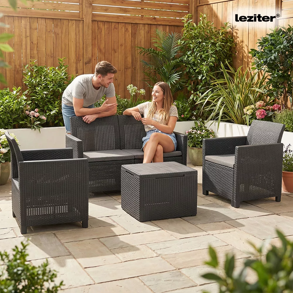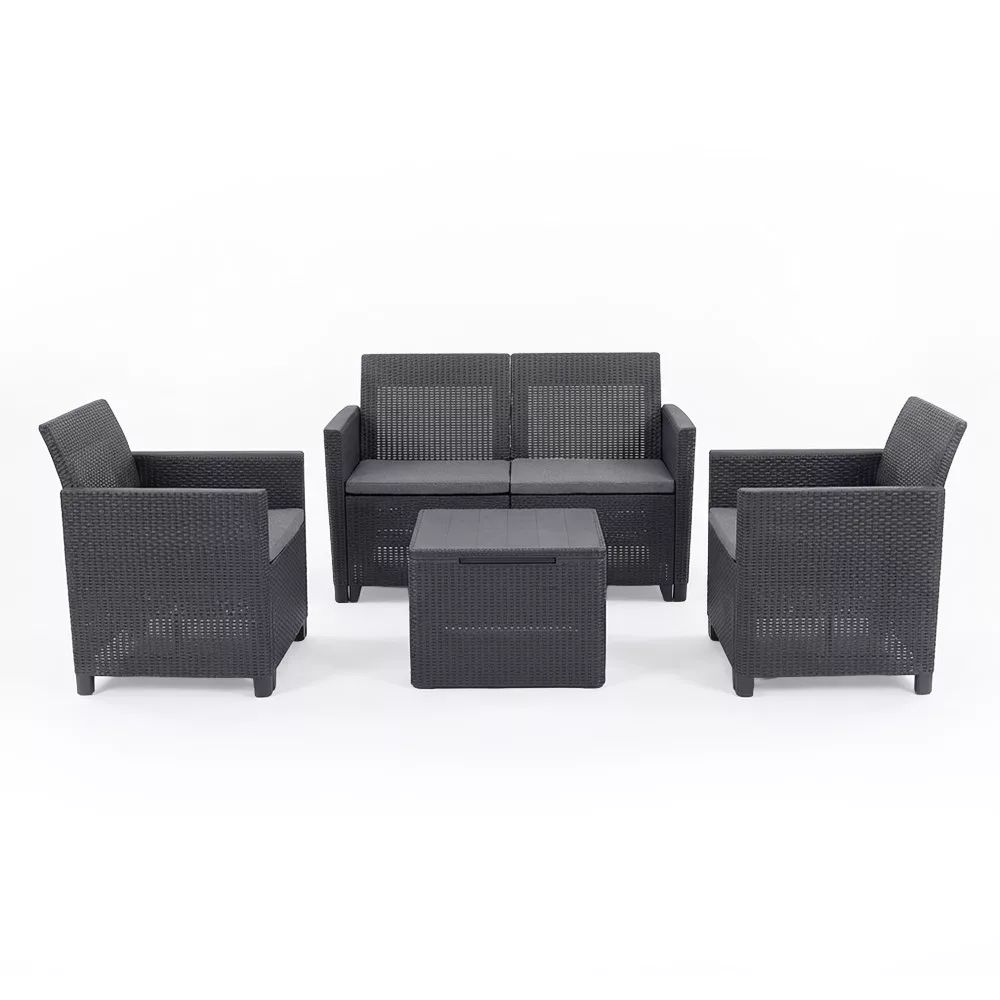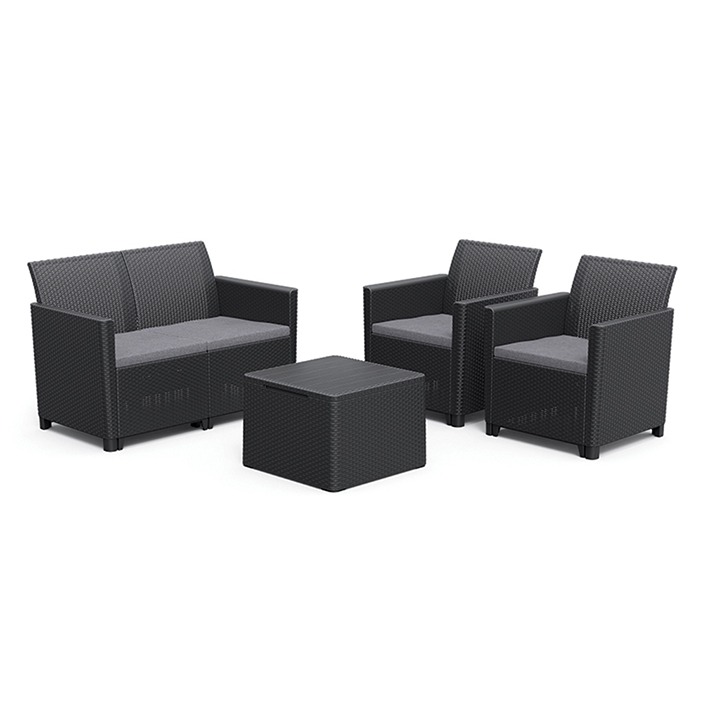 Dostępny w kolorze grafitowym, ten zestaw mebli ogrodowych może pochwalić się lekką, ale wytrzymałą konstrukcją ramy. Co więcej, czyszczenie każdego elementu jest niezwykle łatwe, dzięki czemu można uzyskać nieskazitelne wykończenie w mgnieniu oka.Dostępny w grafitowym odcieniu zestaw wyposażony jest w szare poduszki zapewniające maksymalny komfort, a jednocześnie wygląda stylowo i przyciąga wzrok. Meble wykonane są z mocnego i trwałego tworzywa sztucznego. Mocna, trwała konstrukcja oznacza wysoki stopień niezawodności w praktyce i to, że meble bez wyjątku zapewnią długą żywotność, oprócz radosnego użytkowania, które urozmaica letnie dni, co jest podstawą dzięki pozytywnym aspektom wymienionym powyżej.