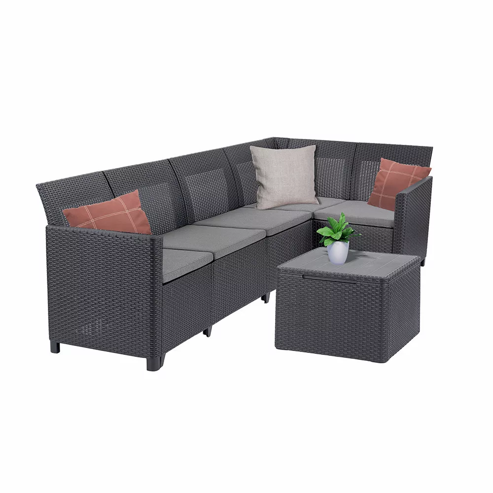 Zawarty w zestawie stolik z poduszkami to nie tylko oszczędność miejsca i praktyczność, ale także stylowy dodatek do miejsca do siedzenia. Dzięki funkcji przechowywania można mieć pod ręką poduszki lub inne akcesoria ogrodowe.