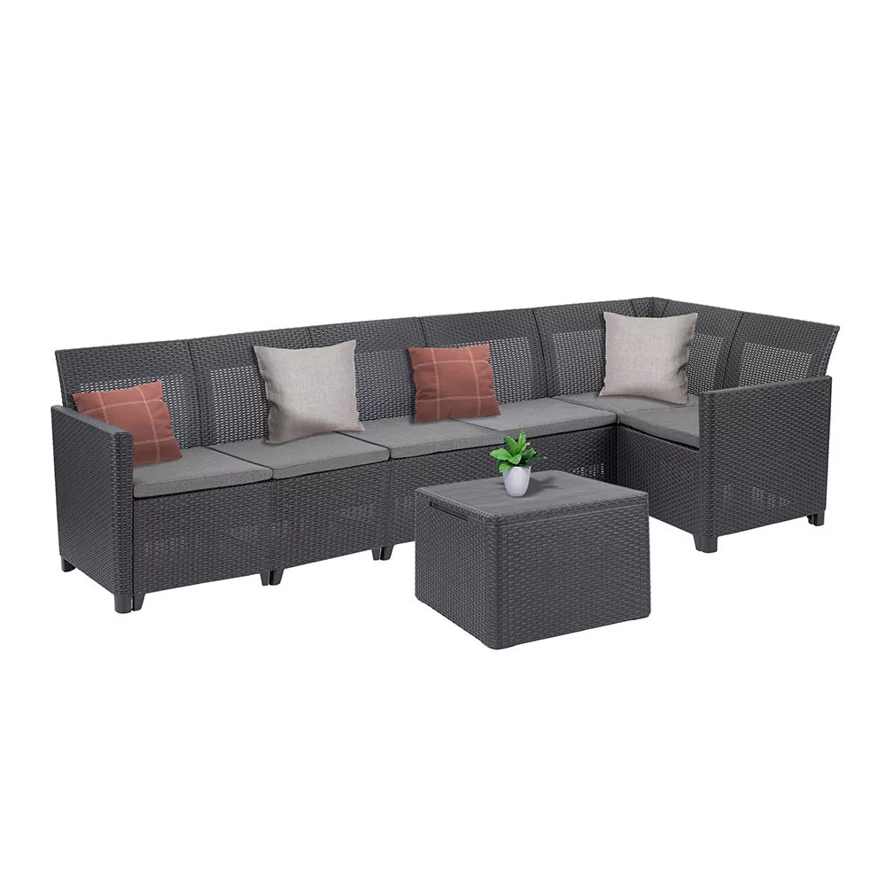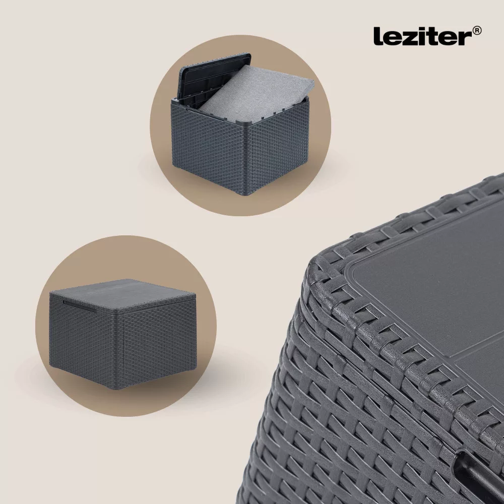 Zawarty w zestawie stolik z poduszkami to nie tylko oszczędność miejsca i praktyczność, ale także stylowy dodatek do miejsca do siedzenia. Dzięki funkcji przechowywania można mieć pod ręką poduszki lub inne akcesoria ogrodowe.