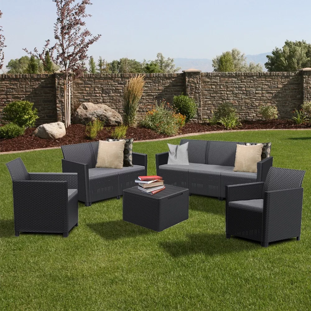 Elegancki zestaw mebli z dwoma fotelami, dwuosobową sofą, trzyosobową sofą i stolikiem z poduszkami, nawiązujący do stylu rattanowego. Ten zestaw mebli sprawi, że letnie dni spędzone w ogrodzie lub na tarasie będą przyjemnym doświadczeniem. Lekka, a zarazem wytrzymała konstrukcja sprawia, że jest on bardzo łatwy w czyszczeniu. Zestaw jest także odporny na uszkodzenia oraz długotrwałe działanie czynników atmosferycznych i promieniowania UV.