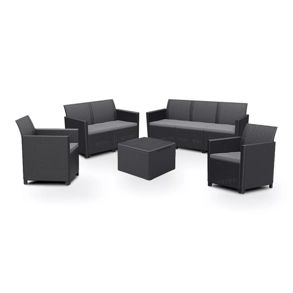 Dostępny w kolorze grafitowym, ten zestaw mebli ogrodowych może pochwalić się lekką, ale wytrzymałą konstrukcją ramy. Co więcej, czyszczenie każdego elementu jest niezwykle łatwe, dzięki czemu można uzyskać nieskazitelne wykończenie w mgnieniu oka.Dostępny w grafitowym odcieniu zestaw wyposażony jest w szare poduszki zapewniające maksymalny komfort, a jednocześnie wygląda stylowo i przyciąga wzrok. Meble wykonane są z mocnego i trwałego tworzywa sztucznego. Mocna, trwała konstrukcja oznacza wysoki stopień niezawodności w praktyce i to, że meble bez wyjątku zapewnią długą żywotność, oprócz radosnego użytkowania, które urozmaica letnie dni, co jest podstawą powyższych pozytywnych cech.