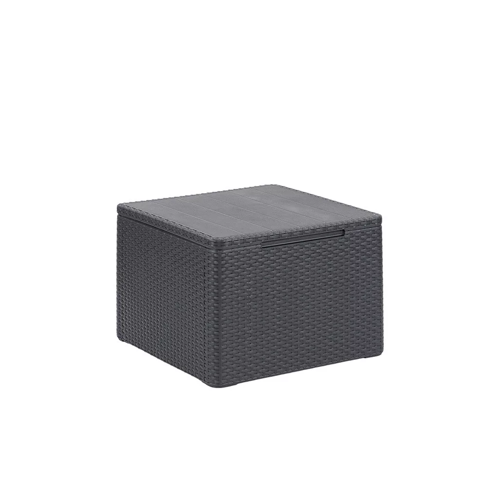 Rattanowy stolik ogrodowy z poduszką w kolorze grafitowym mierzy 55,5 x 55,5 x 38 cm. Jest to wysokiej jakości produkt wykonany z najlepszej jakości tworzywa sztucznego formowanego wtryskowo.