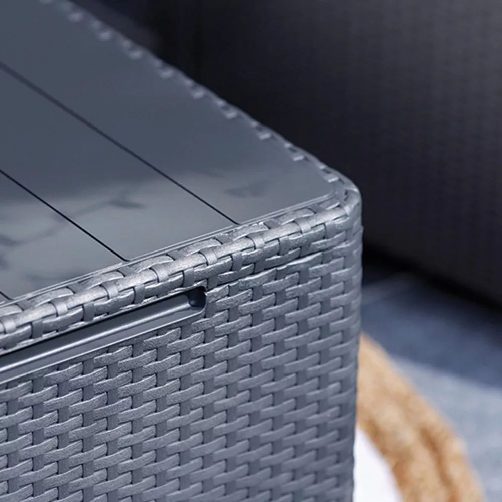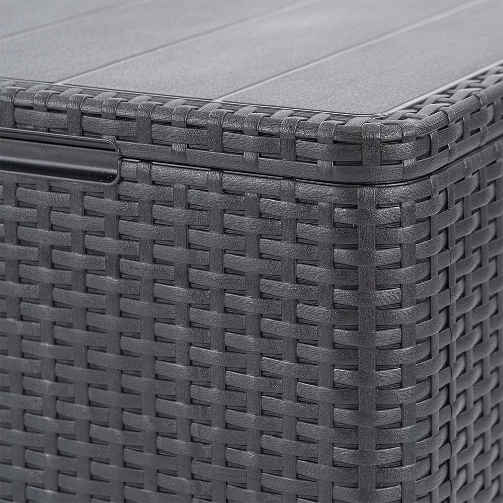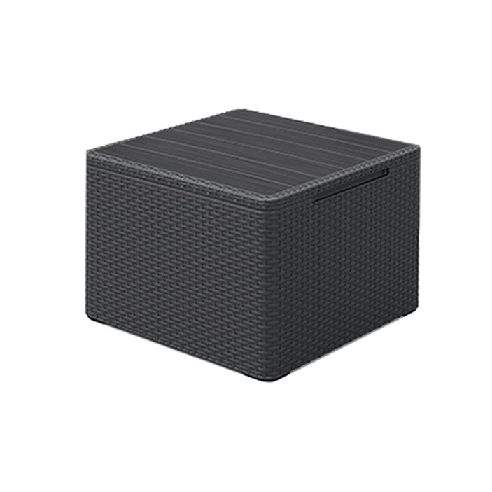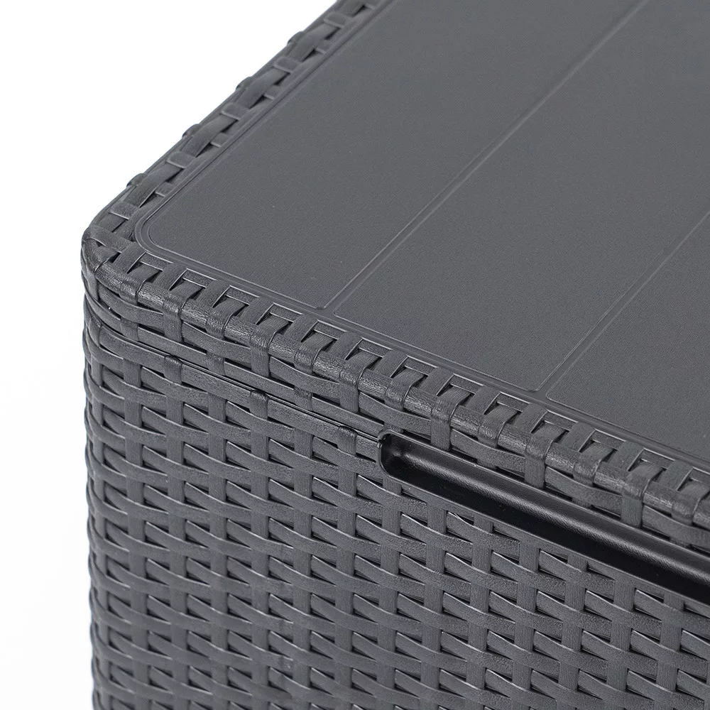Jest to elegancki stolik z uchwytem na poduszkę przypominający styl rattanowy. Mebel ten sprawi, że letnie dni spędzone w ogrodzie lub na tarasie będą przyjemnym doświadczeniem. Mebel ten ubarwi każdy dzień swoim przyjemnym wyglądem. Dzięki temu stolikowi możesz przechowywać poduszki w suchym i bezpiecznym miejscu, gdy nie korzystasz z zestawu ogrodowego. Kwadratowy stół ogrodowy jest pokryty oryginalnym pokrowcem imitującym splot rattanowy. Duży stolik do przechowywania jest również idealny do ogrodów, patio i pomieszczeń wewnętrznych. Bardzo łatwy w montażu i czyszczeniu. Odporny na warunki pogodowe i promienie UV.