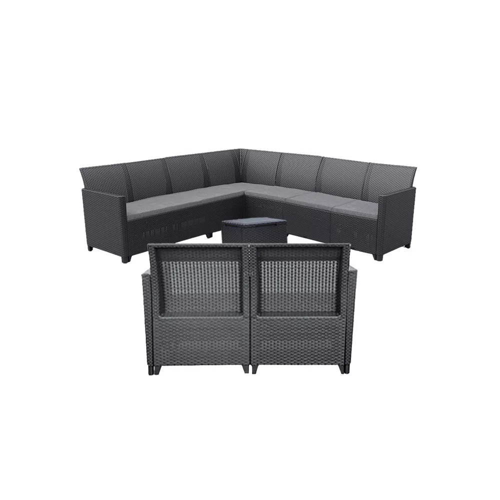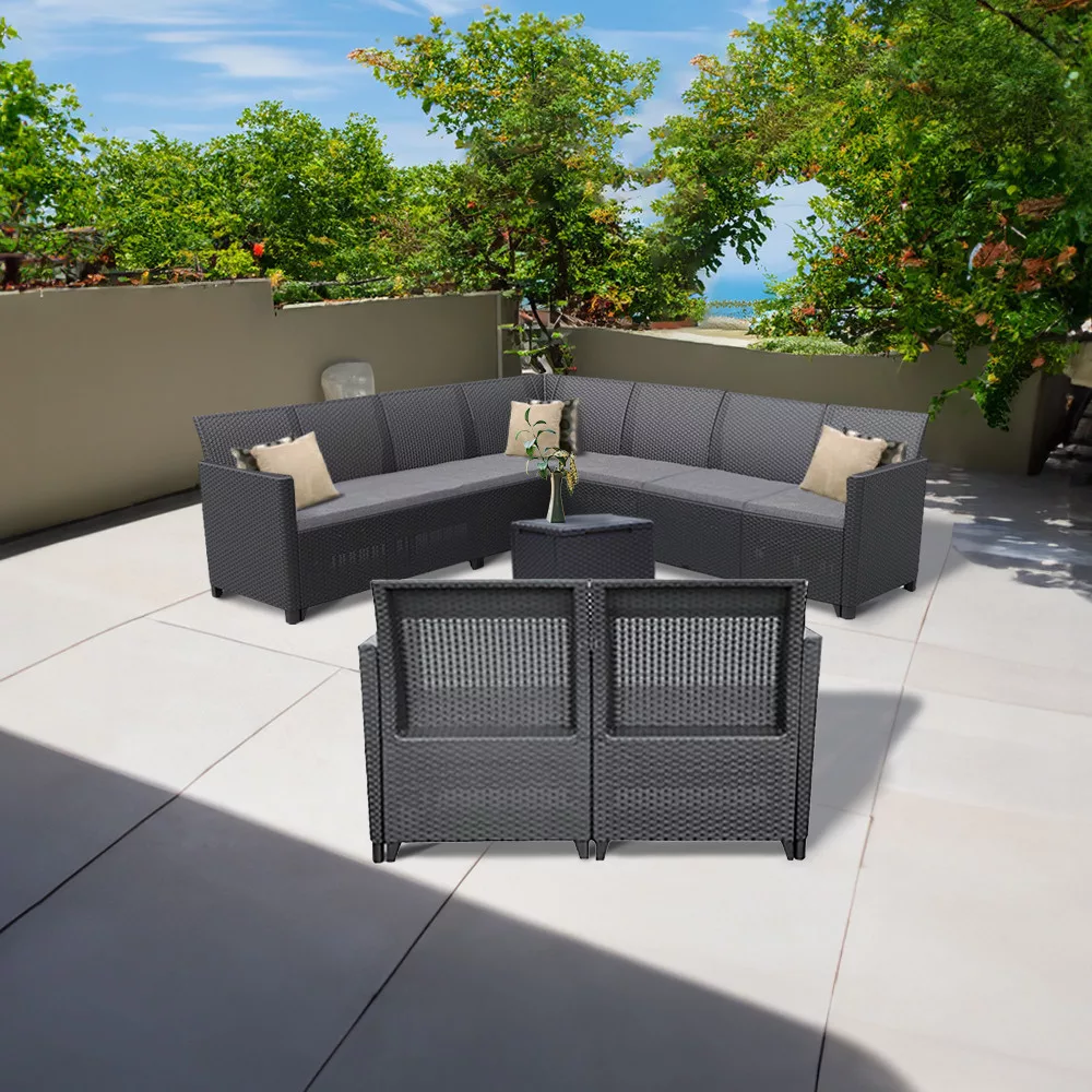 Ten grafitowy zestaw mebli ogrodowych z efektem rattanu zawiera dwa krzesła, 9-osobową sofę narożną, 2-osobową sofę i stolik do przechowywania, wszystkie wykonane z tworzywa sztucznego odpornego na warunki atmosferyczne, dzięki czemu nie musisz się martwić o działanie promieni UV. Wysokość sofy: 74 cm, szerokość: 113 cm, długość: 65 cm. Sofa posiada poduszkę, która sprawia, że jest wygodna i pasuje do koloru mebli. Wysokość stołu: 37 cm, szerokość: 37 cm, długość: 37 cm. Stół jest wielofunkcyjny, dzięki czemu można schować narzędzia ogrodowe w części do przechowywania.