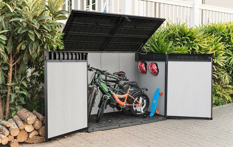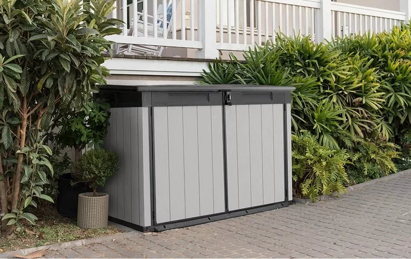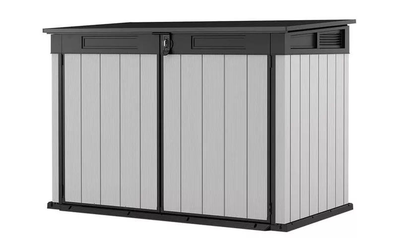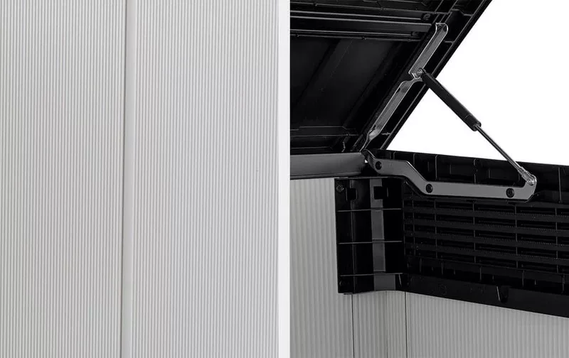 Dodaj super przestronny, wielofunkcyjny schowek do swojego ogrodu. Chociaż nie zajmie dużo miejsca, Premier Jumbo ma dużą pojemność i jest wystarczająco szeroki i wysoki, aby pomieścić wszystko, w tym rowery, sprzęt ogrodowy i meble ogrodowe.Hydrauliczne tłoki na pokrywie ułatwiają jej otwieranie, nawet jedną ręką.Odporne na warunki pogodowe podwójne ściany zapewniają stabilność i nie wymagają konserwacji, a wbudowana wentylacja i płyta podłogowa utrzymują zawartość w czystości, suchości i świeżości.