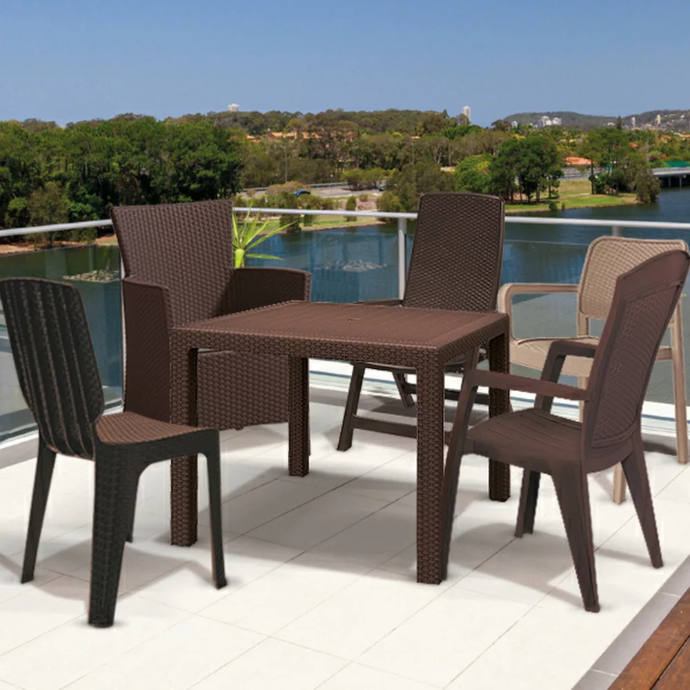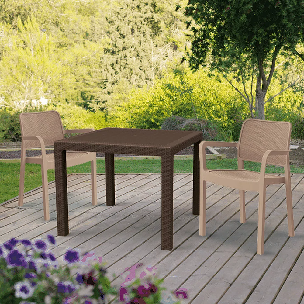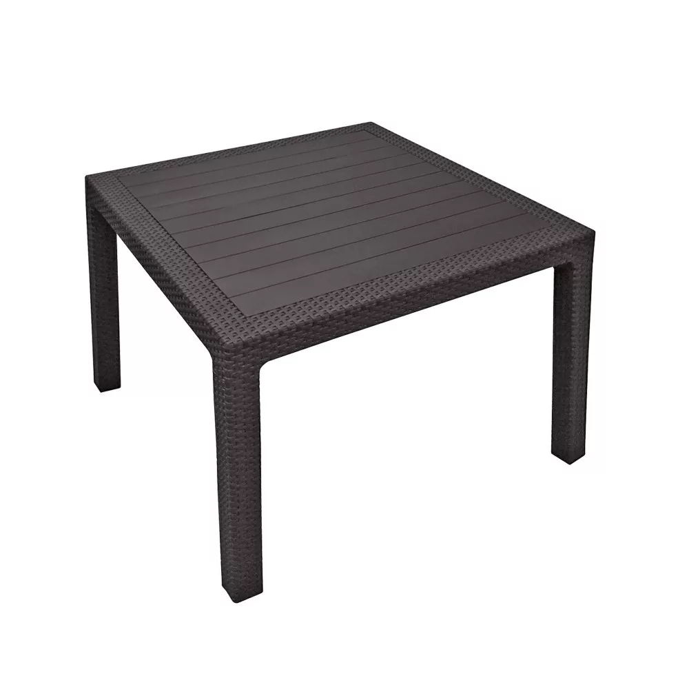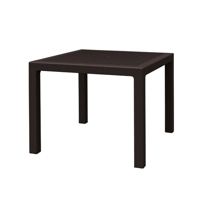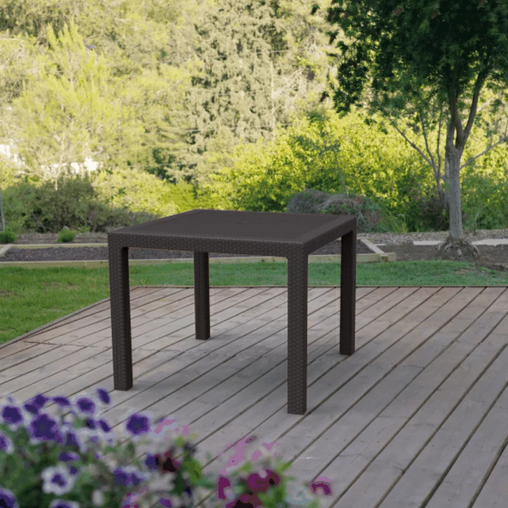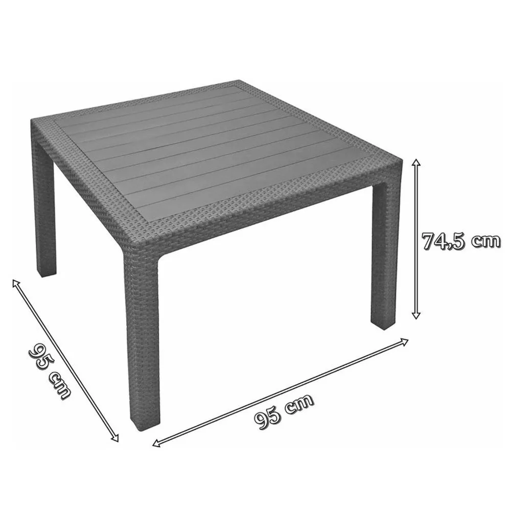 Trwały materiał: wykonany z tworzywa sztucznego odpornego na promieniowanie UV i warunki atmosferyczne. Stół idealnie sprawdzi się w każdej przestrzeni wokół domu, gdzie stworzy idealne miejsce do relaksu na świeżym powietrzu. Jego powierzchnia inspirowana rattanową plecionką to jeden z atutów estetycznych produktu.