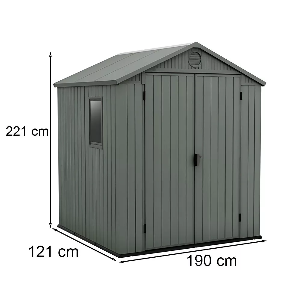 Wymiary: 190 x 182 x 221 cm, zapewniają idealną przestrzeń do przechowywania narzędzi ogrodowych, mebli ogrodowych, a nawet rowerów. Wymiary te idealnie pasują do większości ogrodów, nie zajmując zbyt wiele miejsca.