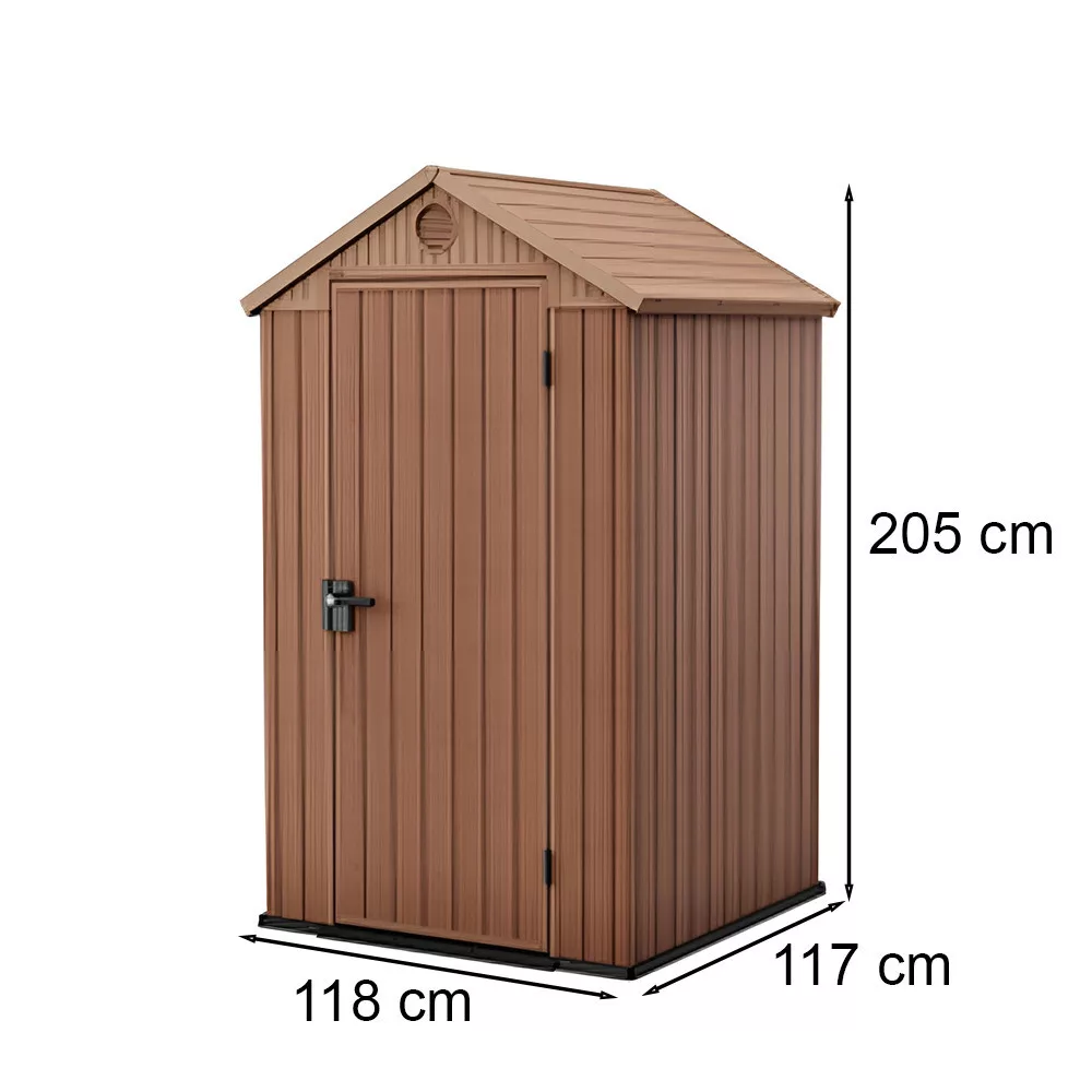 Wymiary: 118 x 117 x 205 cm, zapewniają idealną przestrzeń do przechowywania narzędzi ogrodowych, mebli ogrodowych, a nawet rowerów. Wymiary te idealnie pasują do większości ogrodów, nie zajmując zbyt wiele miejsca.