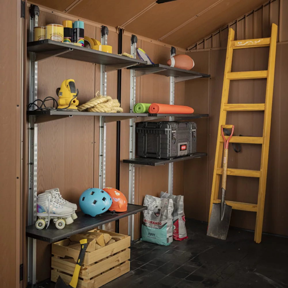 Zestaw 100 półek jest kompatybilny ze wszystkimi szopami Keter z wyjątkiem serii Factor. Wysokość między półkami jest regulowana, dzięki czemu można dostosować obszary przechowywania do własnych potrzeb.