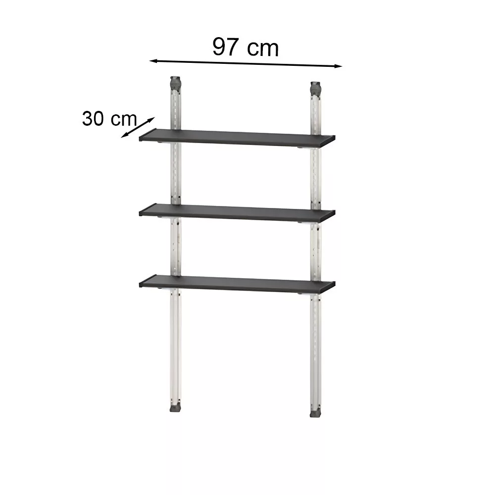 Wymiary produktu to 97 cm szerokości i 30 cm głębokości, a wysokość jest regulowana, co zapewnia maksymalną elastyczność przechowywania. System regałów ma czysty, nowoczesny wygląd, a metalowa konstrukcja gwarantuje długą żywotność.