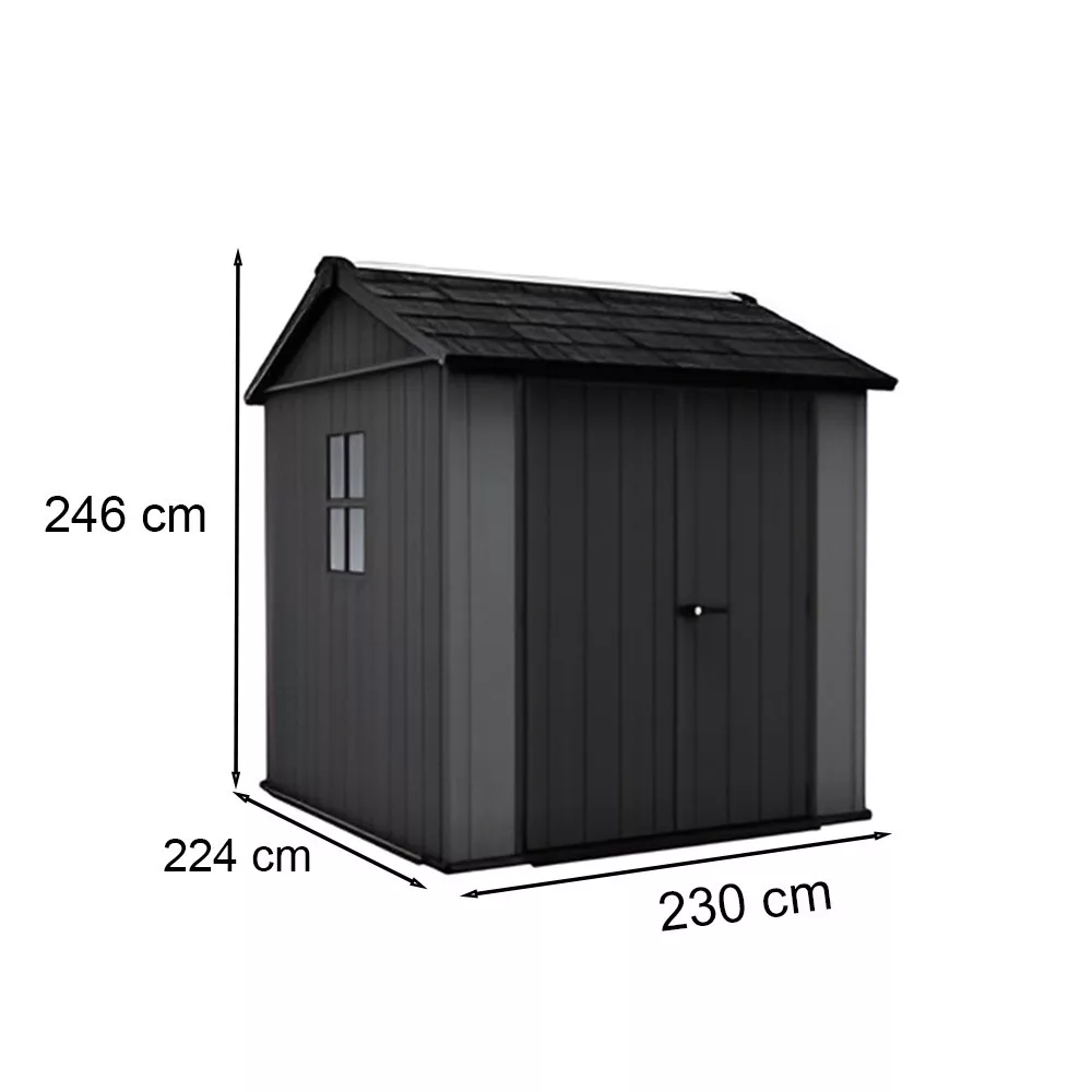 Wymiary 230 cm 223,8 cm i 246 cm są idealne dla większości ogrodów i podwórek, a elegancki szary kolor domku nadaje mu nowoczesny wygląd.
