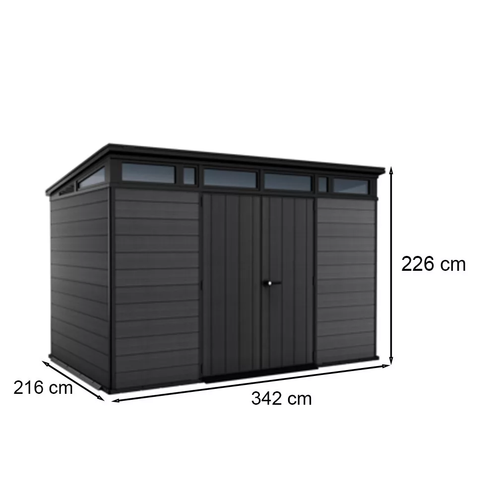 Wymiary produktu - 342 cm szerokości, 216 cm głębokości i 226 cm wysokości - są idealne do przechowywania różnych narzędzi ogrodowych, maszyn i akcesoriów. Łatwa w czyszczeniu powierzchnia i praktyczny układ wnętrza zwiększają wygodę użytkowania.
