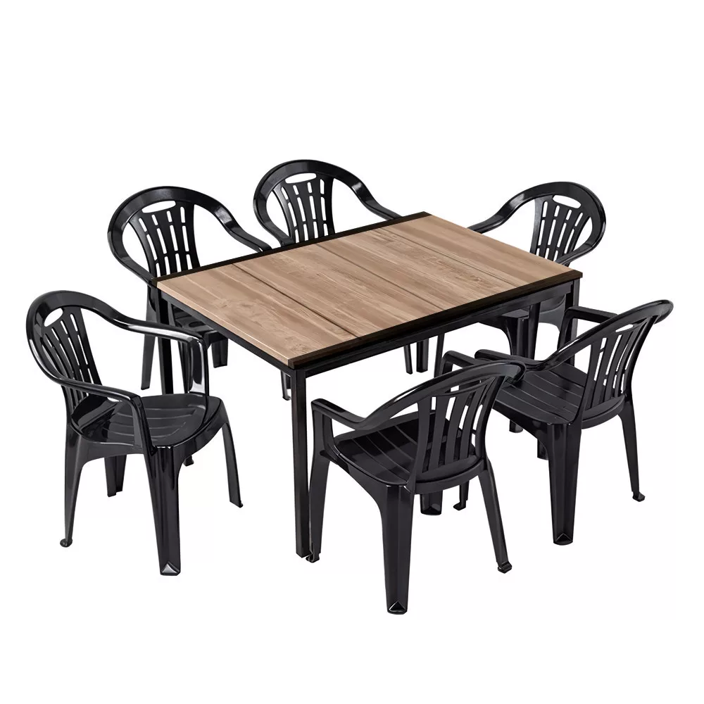 Wysokiej jakości polipropylen formowany wtryskowo nie pęka, nie rdzewieje ani nie blaknie. Możesz zostawić swoje krzesła na zewnątrz w palącym słońcu lub w deszczu - zestaw Rowen jest bezbłędnie odporny na ekstremalne warunki. Wykończenie stołu Porto z efektem drewna DecoCoat™ jest odporne na zarysowania i wodę, a czarna stalowa rama zapewnia solidną stabilność.
