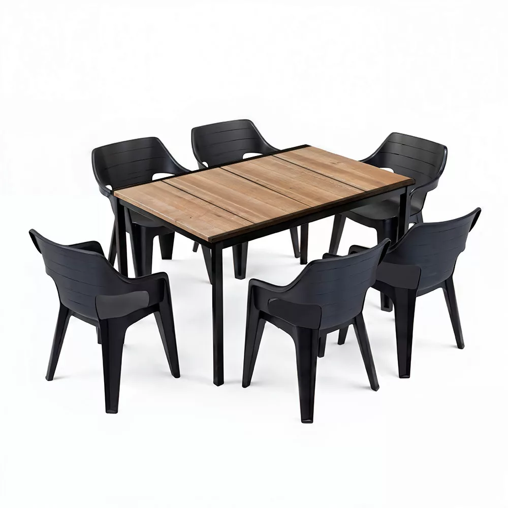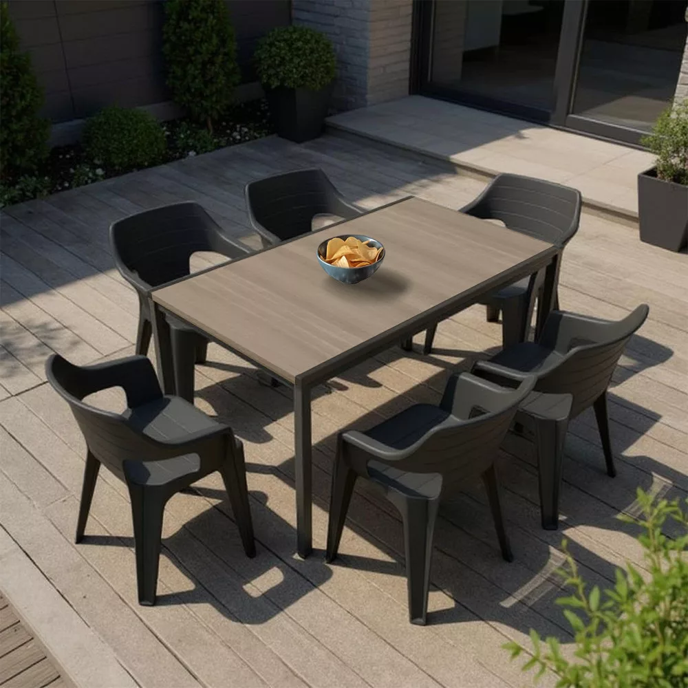 Zarówno krzesła, jak i stół są wykonane z niewymagającego konserwacji, ponadczasowego tworzywa sztucznego. Nawet proste przetarcie usuwa brud, a konstrukcja pozostanie solidna przez wiele lat. Ogólne warunki pogodowe, takie jak deszcz i słońce, nie będą miały na nie wpływu.