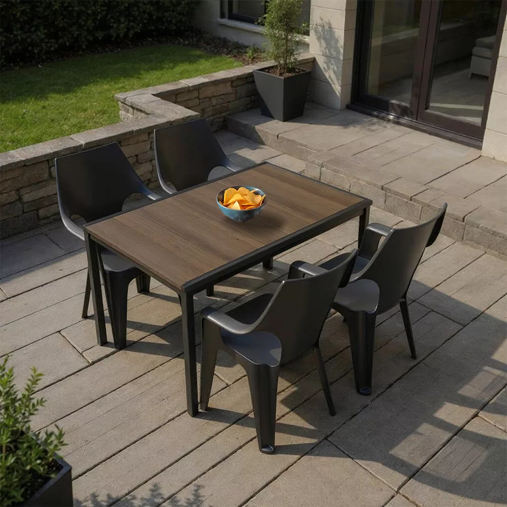 Zestaw mebli ogrodowych Parker 4+1 to idealny wybór, jeśli chcesz, aby posiłki na świeżym powietrzu były równie wygodne jak w domu. Drewniany blat w kolorze orzecha wprowadza ciepłą atmosferę do ogrodu lub patio, podczas gdy grafitowo-szare krzesła tworzą stylowy, nowoczesny kontrast. Taki zestaw jest nie tylko funkcjonalny - może stanowić harmonijny element centralny każdej przestrzeni zewnętrznej.