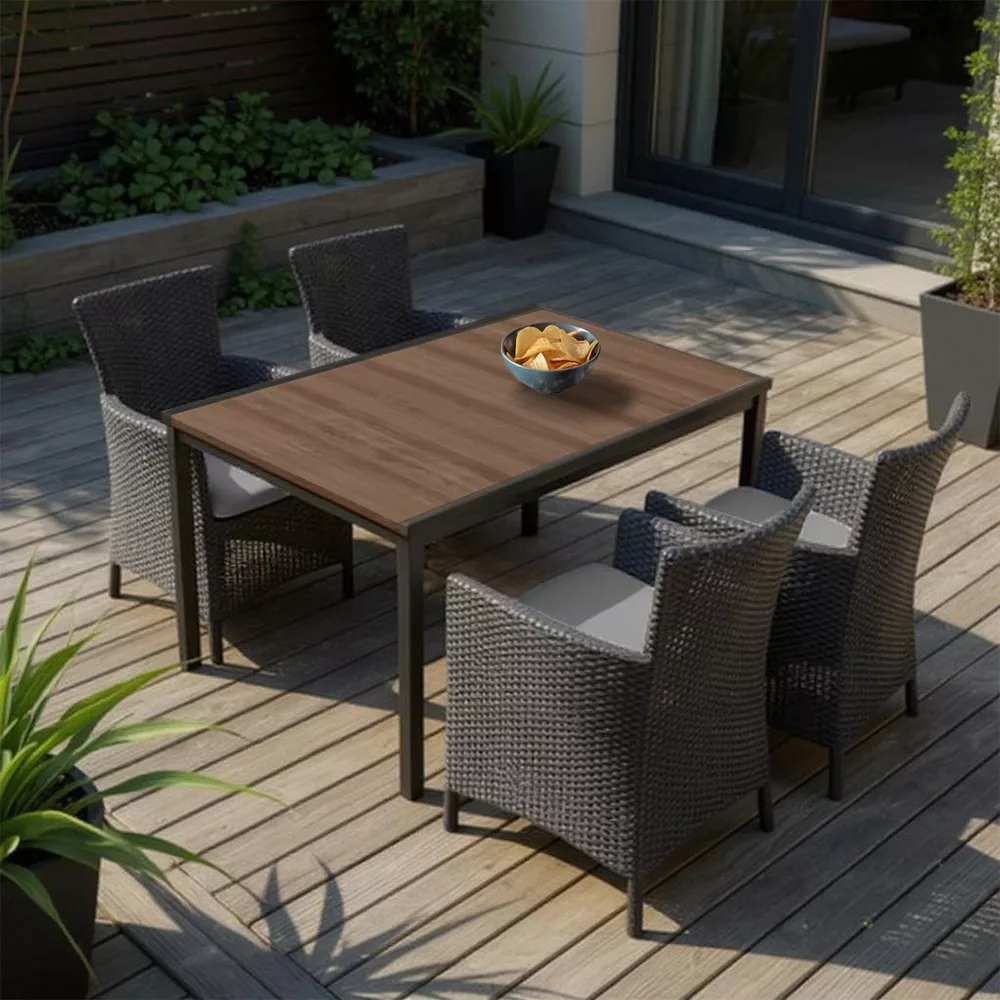 Zestaw zawiera 1 stół ogrodowy Porto 160 + 4 krzesła ogrodowe Iowa Rattan Style z poduszkami.Wymiary stołu: 159 × 95 × 75 cmRozmiar krzesła: 62 × 60 × 89 cmKolory: stół - orzech (efekt drewna), krzesła - grafitMateriał: tworzywo polipropylenowe (stabilizowane UV, wodoodporne)Design: fotele z rattanu z podłokietnikami i wygodną poduszką na siedziskuCechy: odporne na warunki atmosferyczne, łatwe do czyszczenia, trwałeNadaje się do: tarasu, ogrodu, balkonu, domku letniskowego, kawiarniKényelem, ami stílust visz a kertedbeZestaw ogrodowy Nadia 4+1 to idealny wybór dla tych, którzy szukają stylowego, a jednocześnie trwałego zestawu mebli ogrodowych, w którym design i funkcjonalność idą w parze. Odporny na warunki atmosferyczne stół Porto 160 w kolorze orzechowym z wykończeniem drewnopodobnym i fotel Iowa w kolorze grafitowym z poduszkami tworzą harmonijny i wyrafinowany zestaw, który sprawdzi się w każdym ogrodzie lub patio.Dołączona do krzeseł poduszka na siedzisko zapewnia przyjemne uczucie komfortu, sprawiając, że letni poranek lub wieczorna degustacja wina będą wyjątkowo komfortowym doświadczeniem. Siedzisko i oparcie mają lekko pochyloną, ergonomiczną konstrukcję - bez kompromisów w zakresie komfortu.Ponadczasowa jakość, bezobsługowy spokój duchaWszystkie elementy zestawu są ponadczasowe: polipropylenowe krzesła nie wchłaniają wilgoci, nie wypaczają się i nie tracą koloru pod wpływem promieniowania UV. Wykończenie DecoCoat™ stołu Porto zapewnia efekt naturalnego drewna i odporność na zarysowania - a wszystko to bez konieczności dodatkowej konserwacji.Krzesła, podobnie jak stół, są łatwe w czyszczeniu - wystarczy wilgotna ściereczka lub łagodny detergent, aby zapewnić nieskazitelną czystość.Idealny do spożywania posiłków i relaksu dla 4 osób - od rodzinnych śniadań po przyjęcia przy winie z przyjaciółmiBlat stołu o długości 160 cm może wygodnie pomieścić do 6 osób, więc nie musisz iść na kompromis podczas rozrywki. Nowocześnie wyglądające czarne metalowe nogi zapewniają stabilność i nie są podatne na rdzewienie.Naturalna faktura krzeseł z rattanu dodaje przytulnego charakteru przestrzeni zewnętrznej, a poduszki mają subtelnie kontrastujący odcień koloru, aby jeszcze bardziej podkreślić charakter projektu.Dla kogo przeznaczony jest zestaw ogrodowy Nadia 4+1?Dla tych, którzy cenią sobie długoterminową trwałość i odporność na warunki atmosferycznektórzy nie chcą co roku kupować nowego zestawuDla tych, którym zależy na komforcie - fotel z wysokim oparciem i poduszka na pewno go zapewniąLubiących rozwiązania z efektem drewna, ale niewymagające konserwacji Osoby poszukujące stylowych, ale funkcjonalnych mebli ogrodowych do domu, domku letniskowego lub lokalu gastronomicznego.Uczyń swój ogród lub patio bardziej przytulnym z zestawem ogrodowym Nadia 4+1 - gdzie forma, funkcjonalność i komfort łączą się w jedną idealną całość!