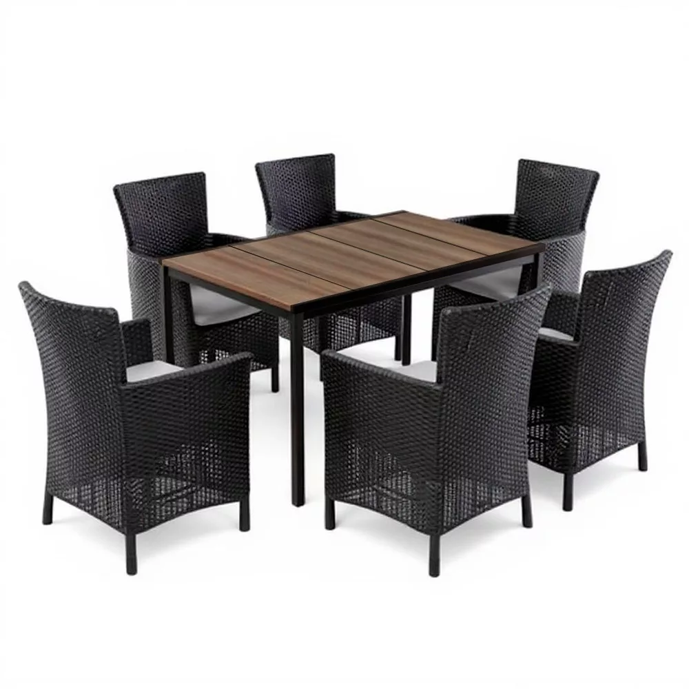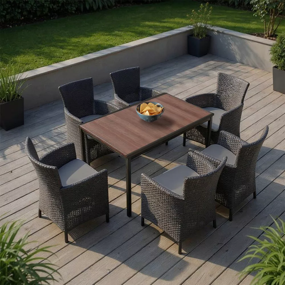 Zestaw zawiera 1 stół ogrodowy Porto 160 + 6 krzeseł ogrodowych Iowa Rattan Style z poduszkami.Wymiary stołu: 159 × 95 × 75 cmRozmiar krzesła: 62 × 60 × 89 cmKolory: stół - orzech (efekt drewna), krzesła - grafitMateriał: tworzywo polipropylenowe (stabilizowane UV, wodoodporne)Design: fotele z rattanu z podłokietnikami i wygodną poduszką na siedziskuCechy: odporne na warunki atmosferyczne, łatwe do czyszczenia, trwałeNadaje się do: tarasu, ogrodu, balkonu, domku letniskowego, kawiarniKényelem, ami stílust visz a kertedbeZestaw ogrodowy Nadia 6+1 to idealny wybór dla tych, którzy szukają stylowego, a jednocześnie trwałego zestawu mebli ogrodowych, w którym design i funkcjonalność idą w parze. Odporny na warunki atmosferyczne stół Porto 160 w kolorze orzechowym z wykończeniem drewnopodobnym i fotel Iowa w kolorze grafitowym z poduszkami tworzą harmonijny i wyrafinowany zestaw, który sprawdzi się w każdym ogrodzie lub patio.Dołączona do krzeseł poduszka na siedzisko zapewnia przyjemne uczucie komfortu, sprawiając, że letni poranek lub wieczorna degustacja wina będą wyjątkowo komfortowym doświadczeniem. Siedzisko i oparcie mają lekko pochyloną, ergonomiczną konstrukcję - bez kompromisów w zakresie komfortu.Ponadczasowa jakość, bezobsługowy spokój duchaWszystkie elementy zestawu są ponadczasowe: polipropylenowe krzesła nie wchłaniają wilgoci, nie wypaczają się i nie tracą koloru pod wpływem promieniowania UV. Wykończenie DecoCoat™ stołu Porto zapewnia efekt naturalnego drewna i odporność na zarysowania - a wszystko to bez konieczności dodatkowej konserwacji.Krzesła, podobnie jak stół, są łatwe w czyszczeniu - wystarczy wilgotna ściereczka lub łagodny detergent, aby zapewnić nieskazitelną czystość.Idealna jadalnia i strefa wypoczynkowa dla 6 osób - od rodzinnych śniadań po spotkania przy winie z przyjaciółmiBlat stołu o długości 160 cm może wygodnie pomieścić 6 osób, więc nie musisz iść na kompromis podczas rozrywki. Nowocześnie wyglądające czarne metalowe nogi zapewniają stabilność i nie są podatne na rdzewienie.Naturalna faktura krzeseł z rattanu dodaje przytulnego charakteru przestrzeni na zewnątrz, a poduszki mają subtelnie kontrastujący odcień koloru, aby jeszcze bardziej podkreślić charakter projektu.Dla kogo przeznaczony jest zestaw ogrodowy Nadia 6+1?Dla tych, którzy cenią sobie długoterminową trwałość i odporność na warunki atmosferyczneDla tych, którzy nie chcą co roku kupować nowego zestawuDla tych, którym zależy na komforcie - fotel z wysokim oparciem i poduszka na pewno go zapewniąLubiących rozwiązania z efektem drewna, ale niewymagające konserwacji Osoby poszukujące stylowych, ale funkcjonalnych mebli ogrodowych do domu, domku letniskowego lub lokalu gastronomicznego.Spraw, by Twój ogród lub patio stały się bardziej przytulne dzięki zestawowi ogrodowemu Nadia 6+1 - gdzie forma, funkcjonalność i komfort łączą się w jedną idealną całość!
