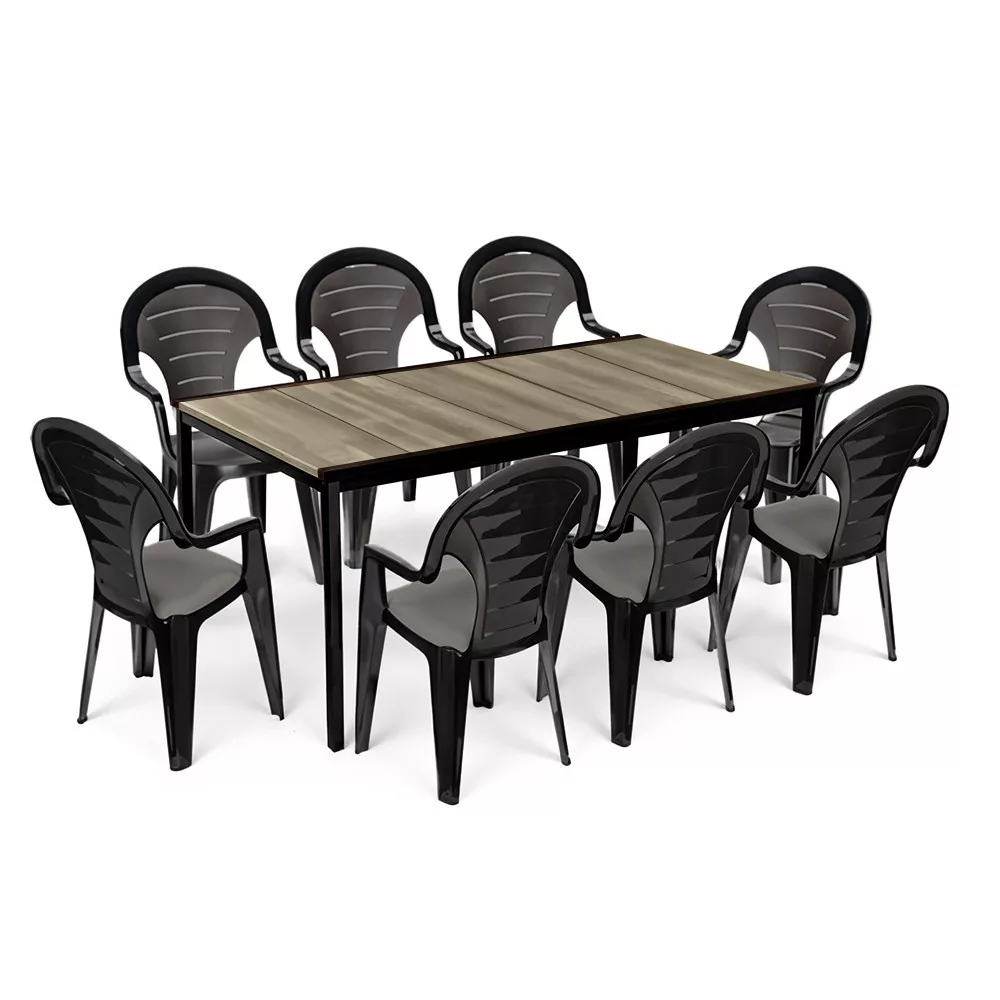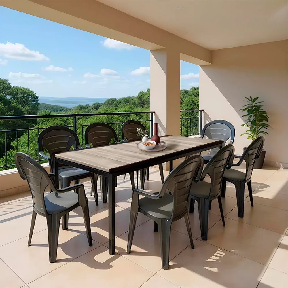 Ciepły popielaty blat i grafitowe krzesła tworzą elegancki, nowoczesny wygląd. Niezależnie od tego, czy Twoje patio ma skandynawski, śródziemnomorski czy industrialny charakter, LagosLarge stanie się wyrafinowanym punktem centralnym.