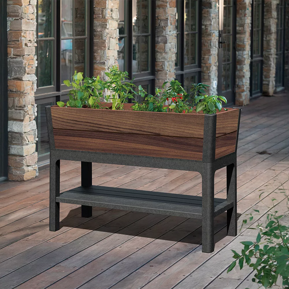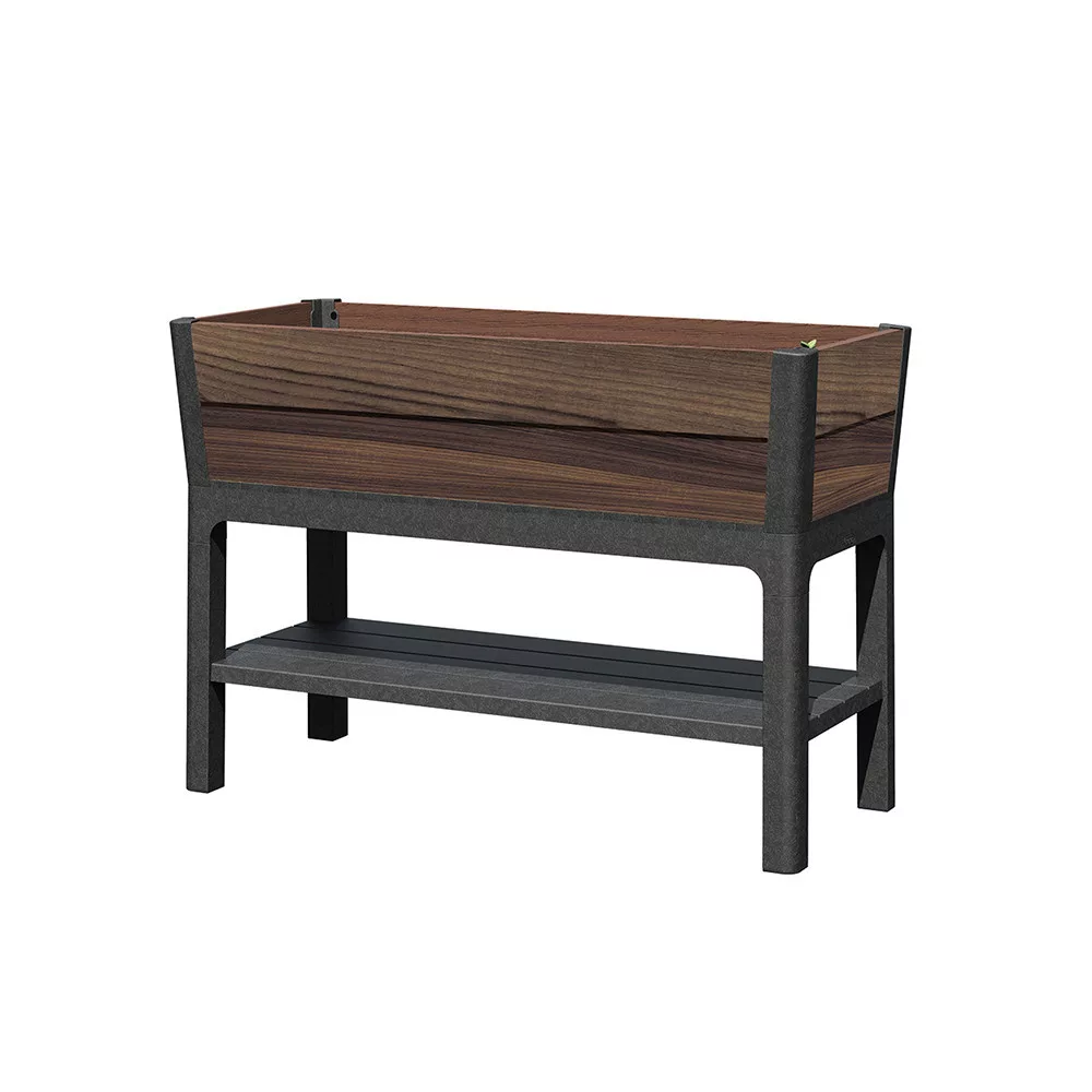 Plastikowa donica ogrodowa Keter Deco Elevated z dolną półką ma 113 cm długości, 47,5 cm szerokości i 79,8 cm wysokości, co zapewnia idealną wysokość roboczą do wygodnej pracy w ogrodzie bez schylania się. Zintegrowany inteligentny system nawadniania i wskaźnik poziomu wody zapewniają, że rośliny otrzymują dokładnie tyle wody, ile potrzebują. Dzięki wbudowanemu kranowi można nawet kontrolować drenaż. Nowoczesna konstrukcja z drewna orzechowego jest nie tylko praktyczna, ale także estetyczna, nawet na miejskim balkonie.