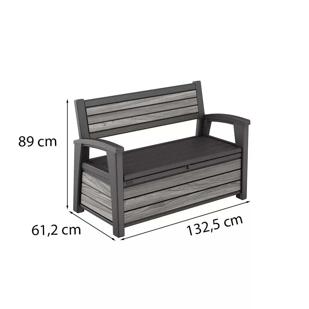 KeterDecocoat Plastic Garden Bench/Storage 227 L w kolorze Storm Grey to idealne połączenie estetycznego wyglądu i praktycznego przechowywania. Szeroka na 132,5 cm, wysoka na 89 cm i głęboka na 61,2 cm, zapewnia dużo miejsca na różnorodne rzeczy - od węży do podlewania po poduszki ogrodowe. Wykonany z wytrzymałego, odpornego na warunki atmosferyczne tworzywa sztucznego z wykończeniem imitującym drewno, elegancko pasuje do każdego ogrodu lub patio. Pokrywa z podnośnikiem gazowym zapewnia łatwe otwieranie i można ją zamknąć na kłódkę (kłódka nie jest dołączona do zestawu).