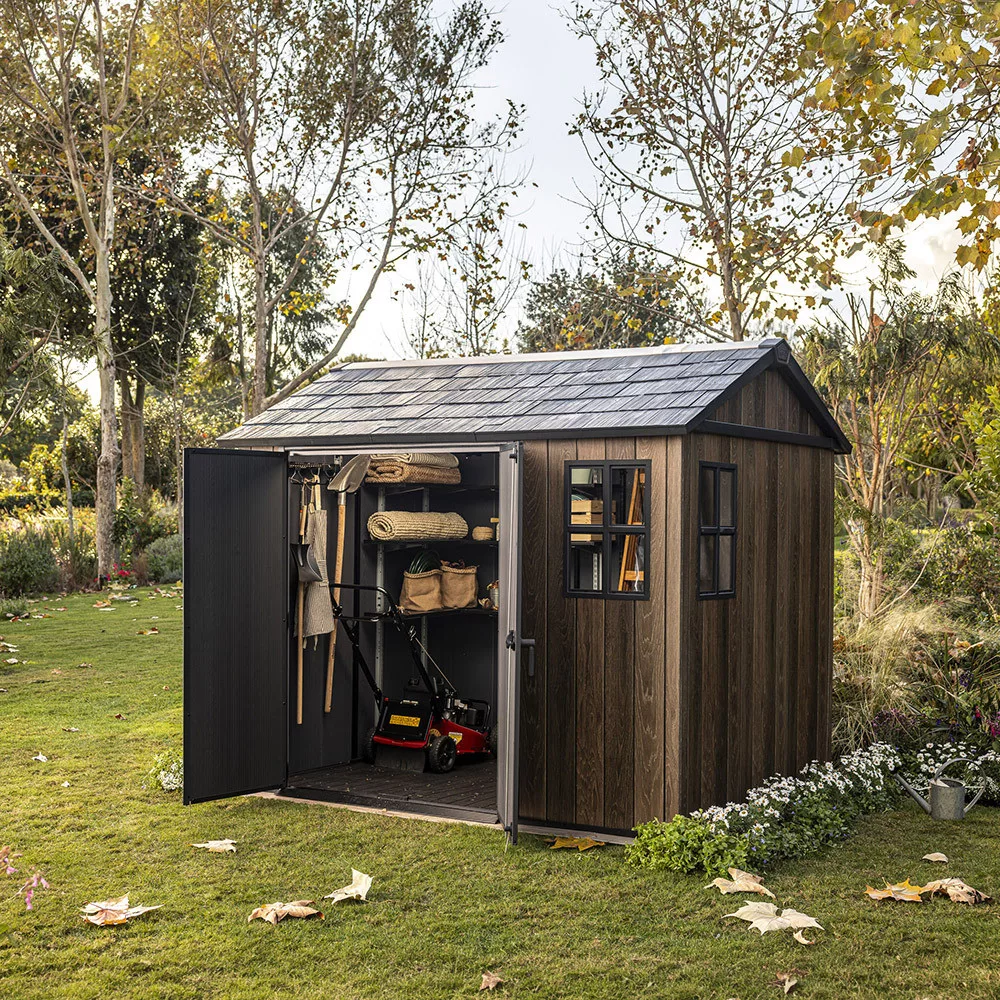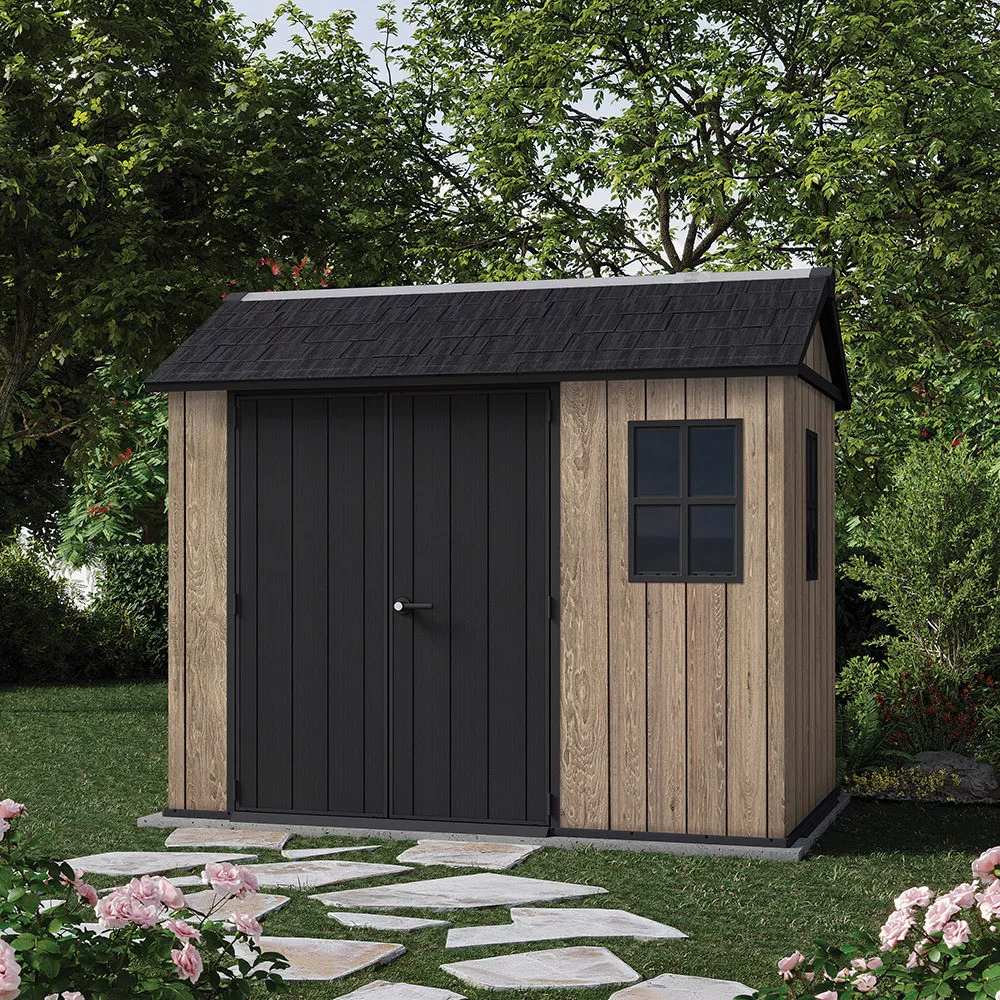 Az Apex 7,5x9/9x7,5 műanyag kerti ház a modern kialakítást ötvözi a praktikus használhatósággal. A tágas belső tér lehetővé teszi kerti szerszámok, gépek, bútorok vagy sportfelszerelések rendszerezett tárolását, miközben a természetes hatású felület esztétikusan illeszkedik a kerti környezetbe.