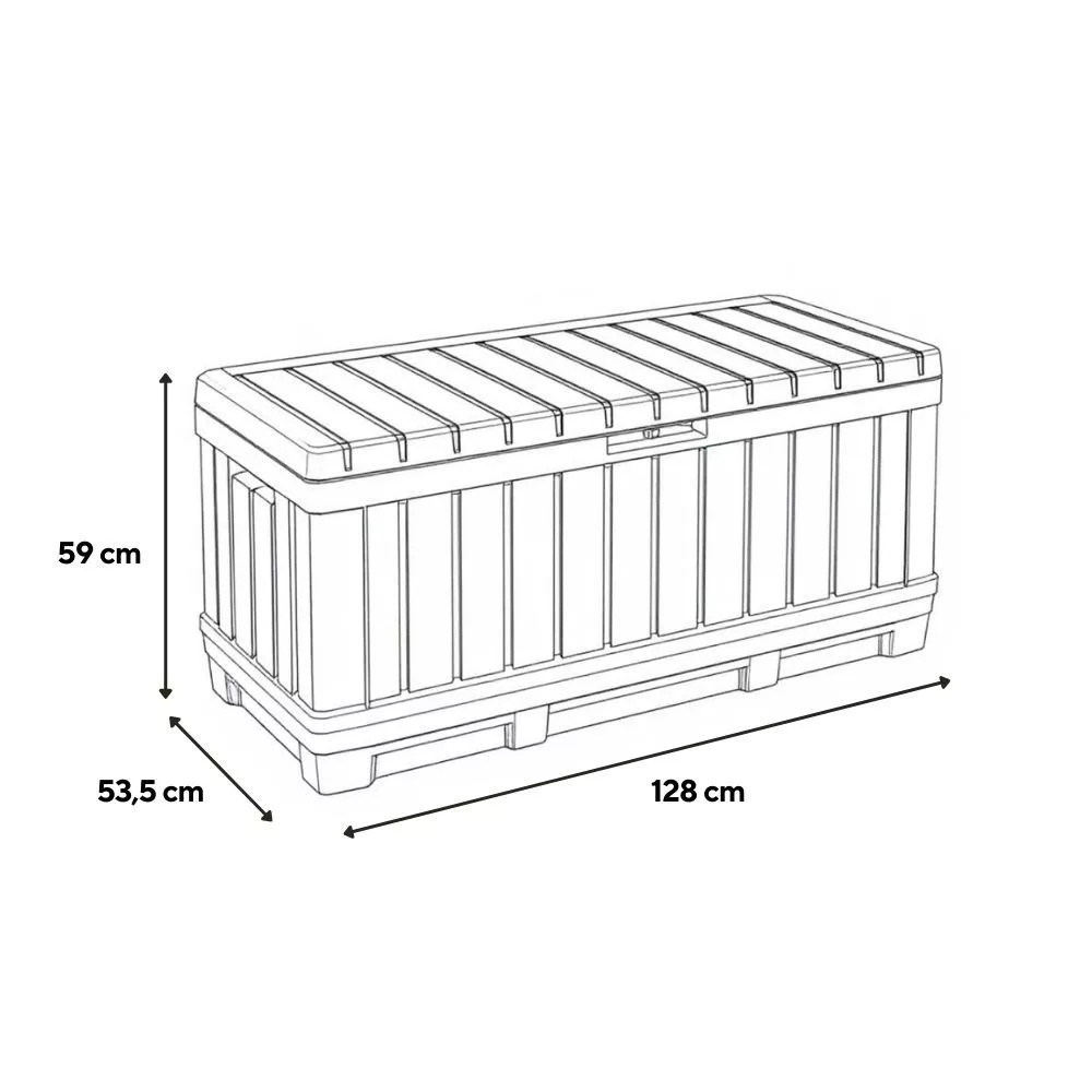 Plastikowy pojemnik ogrodowy Decocoat Kentwood 350L orzech włoskiCałkowite dane produktuNazwa produktu: Plastikowy pojemnik ogrodowy Decocoat Kentwood 350L orzech włoskiPojemność: 350LKolor: panele boczne z efektem orzecha, antracytowa pokrywa i ramaMateriał: wykończenie z tworzywa sztucznego, wykończenie z efektem drewnaKonstrukcja: dach na zawiasach, zintegrowane uchwytyOdpowiedni do użytku na zewnątrz: takWymiary zewnętrzne: 128 × 53,5 × 59 cmPlastikowy pojemnik ogrodowy o pojemności 350 litrów na większe narzędzia ogrodowePlastikowy pojemnik ogrodowy Decocoat Kentwood 350L Walnut to idealny wybór, jeśli potrzebujesz większej pojemności do przechowywania w ogrodzie lub na patio. Wnętrze o pojemności 350 litrów zapewnia wystarczająco dużo miejsca do przechowywania poduszek ogrodowych, węży do podlewania, narzędzi, koców lub akcesoriów sezonowych w zorganizowany sposób. Otwierany dach zapewnia wygodny dostęp do przechowywanych przedmiotów.Skrzynia ogrodowa z drewna orzechowego o nowoczesnym wyglądzieWzór drewna orzechowego nadaje schowkowi naturalny wygląd, który harmonijnie łączy się z nowoczesnymi i klasycznymi stylami projektowania ogrodów. Antracytowa pokrywa i rama dodają czystego kontrastu do ogólnego wyglądu, dzięki czemu skrzynia do przechowywania jest nie tylko praktyczna, ale także estetyczna dla przestrzeni zewnętrznej.Praktyczny schowek ogrodowy w większym rozmiarzeSolidna konstrukcja i kompaktowy kształt pozwalają na umieszczenie skrzyni na patio, w ogrodzie, a nawet na dużym balkonie. Zintegrowane uchwyty ułatwiają przenoszenie skrzynki w razie potrzeby, umożliwiając jej elastyczne dostosowanie do układu przestrzeni zewnętrznej.Dla kogo przeznaczony jest plastikowy kosz ogrodowy Decocoat Kentwood 350L orzech włoski? Zalecany dla każdego, kto szuka pojemnego kosza ogrodowego o pojemności 350 litrów do przechowywania poduszek, narzędzi lub innych akcesoriów ogrodowych. Idealny do rodzinnych ogrodów przydomowych, większych patio lub dowolnego środowiska zewnętrznego, w którym ważny jest schludny wygląd i odpowiednia przestrzeń do przechowywania.