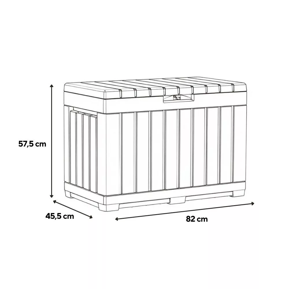 Naturalnie wyglądający wzór drewna jesionowego i ciemne obramowanie nadają skrzyni do przechowywania nowoczesny, ale przyjazny wygląd. Konstrukcja dobrze komponuje się również z meblami ogrodowymi z efektem drewna i czystym wystrojem patio, dzięki czemu schowek jest nie tylko praktyczny, ale także stanowi harmonijny dodatek do przestrzeni zewnętrznej.