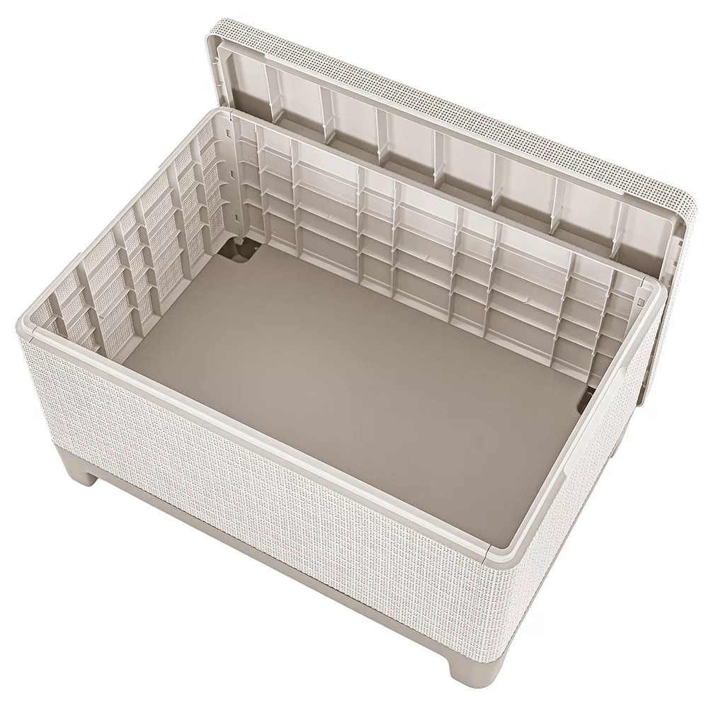 Idealny dla tych, którzy szukają zestawu mebli ogrodowych w kolorze szaro-beżowym, odpornych na warunki atmosferyczne mebli ogrodowych z tworzywa sztucznego, kompaktowego rozwiązania na małe patio lub balkon lub stołu ogrodowego z miejscem do przechowywania. Solidny, nowoczesny i wygodny zestaw do siedzenia na zewnątrz na długi czas.